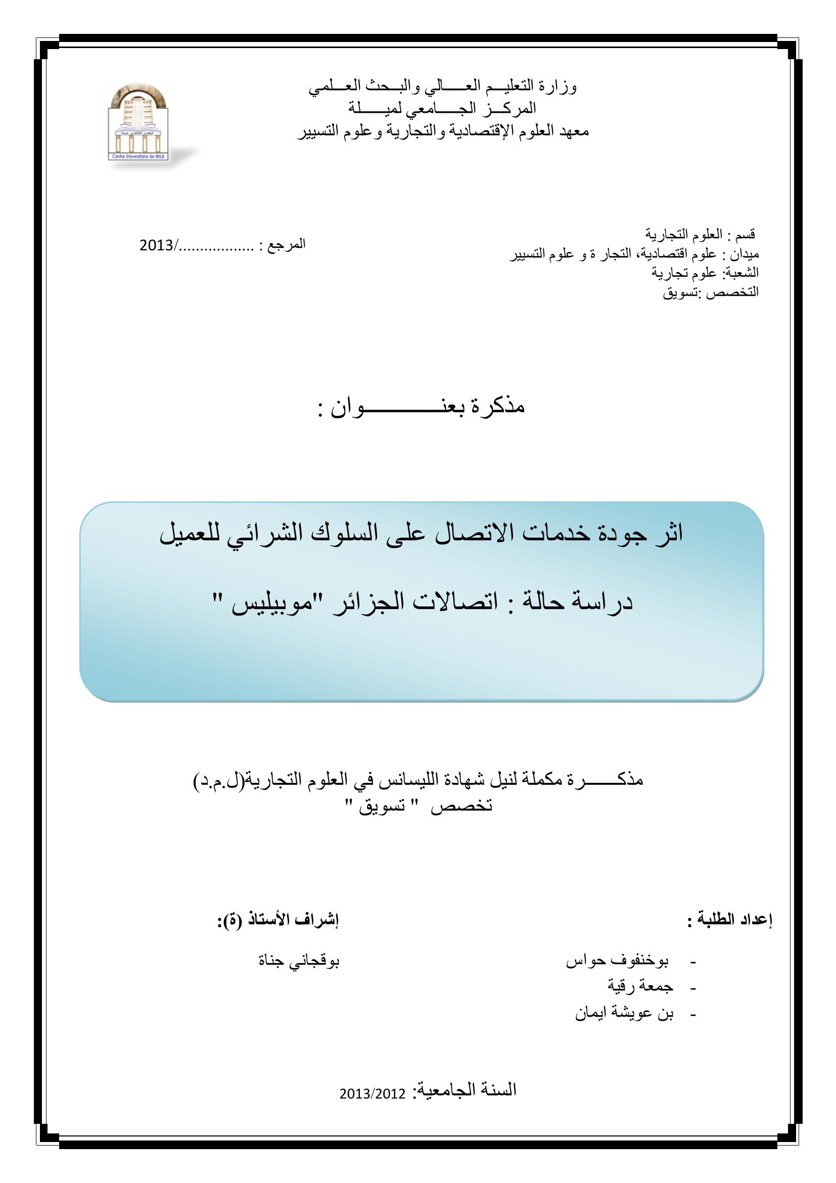 بوخنفوف حواس & بوقجاني جنات (مشرفا) (2013). اثر جودة خدمات الاتصال على السلوك الشرائي للعميل دراسة حالة اتصالات الجزائر موبيليس.