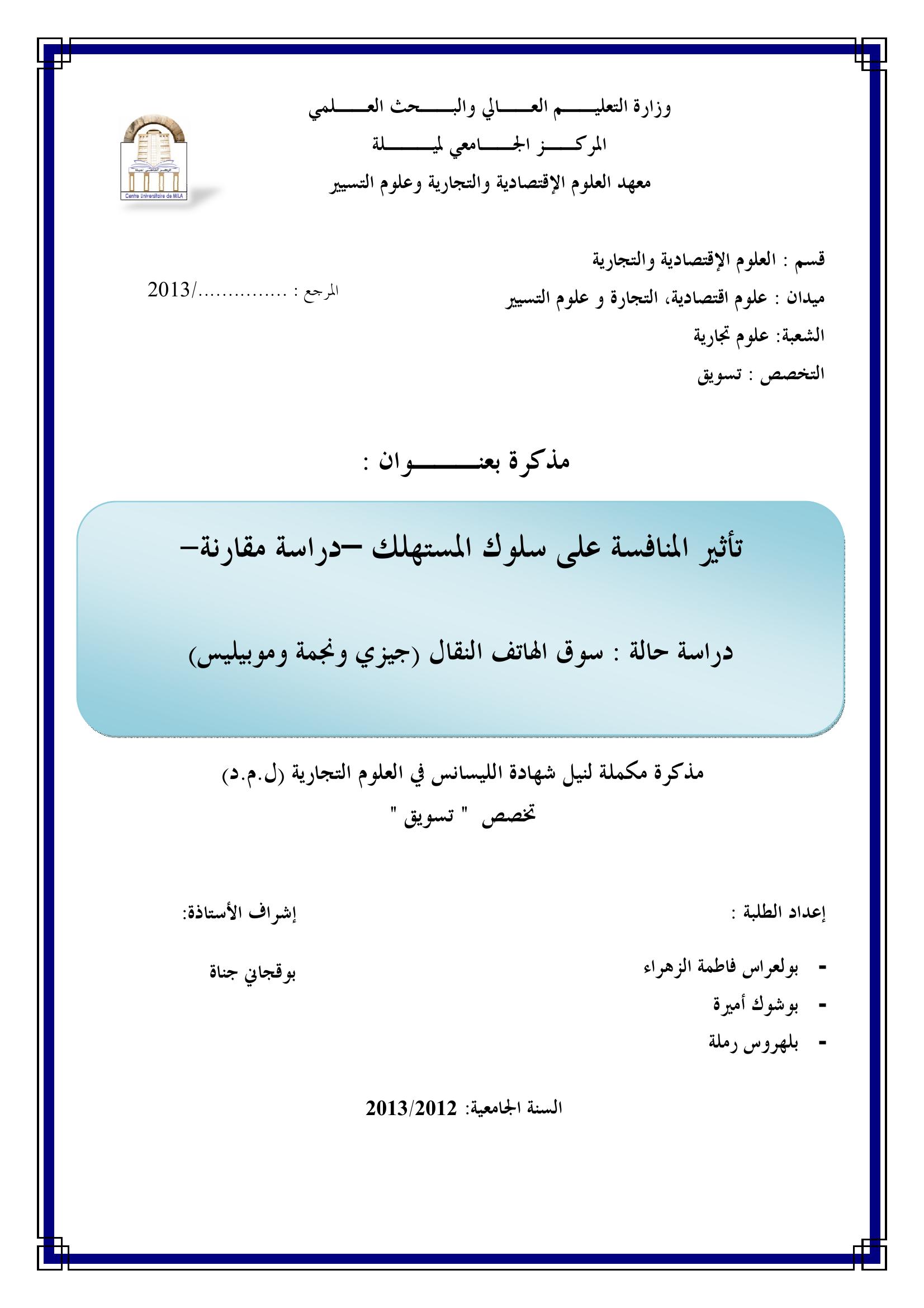 بولعراس فاطمة الزهراء & بوقجاني جنات (مشرفا) (2013). تأثير المنافسة على سلوك المستهلك - دراسة مقارنة دراسة حالة سوق الهاتف النقال ( جيزي ونجمة و موبيليس ).