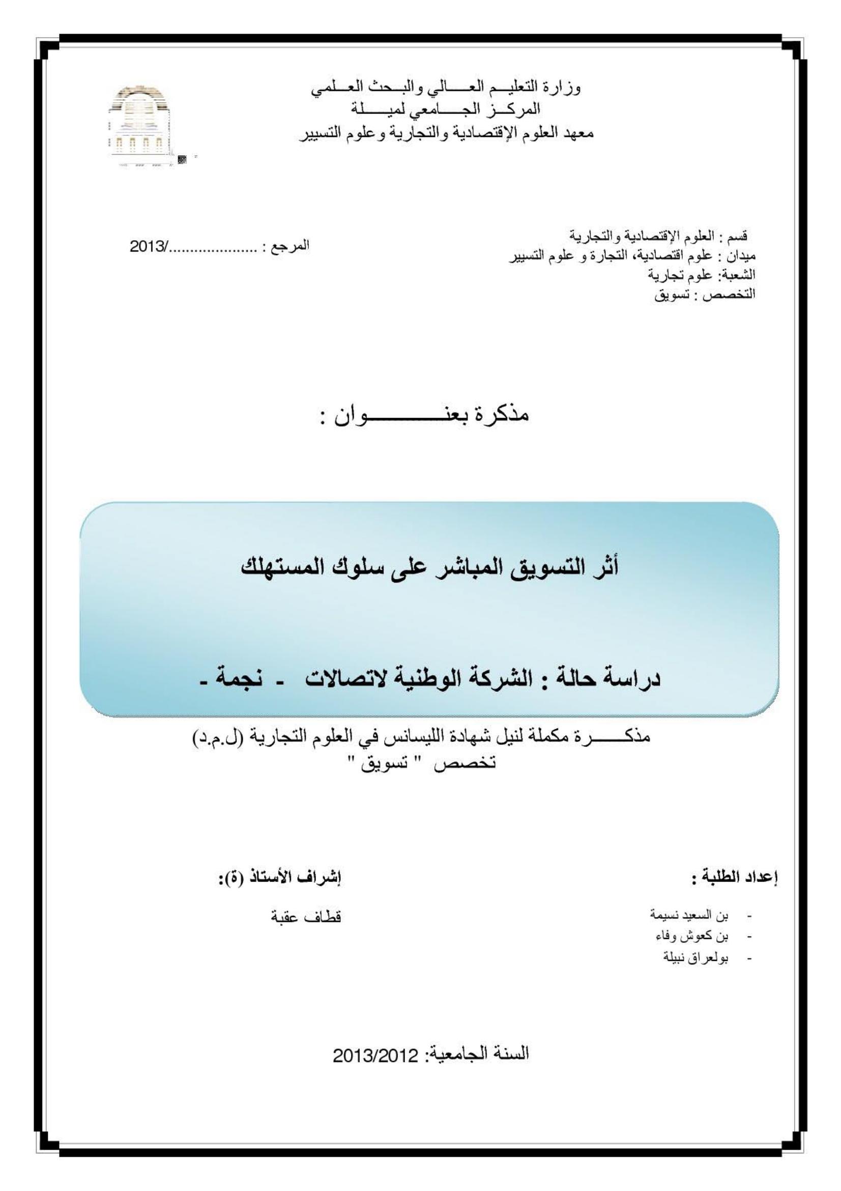 بن السعيد نسيمة & قطاف عقبة(مشرفا) (2013). أثر التسويق المباشر على سلوك المستهلك دراسة حالة الشركة الوطنية لاتصالات - نجمة -.