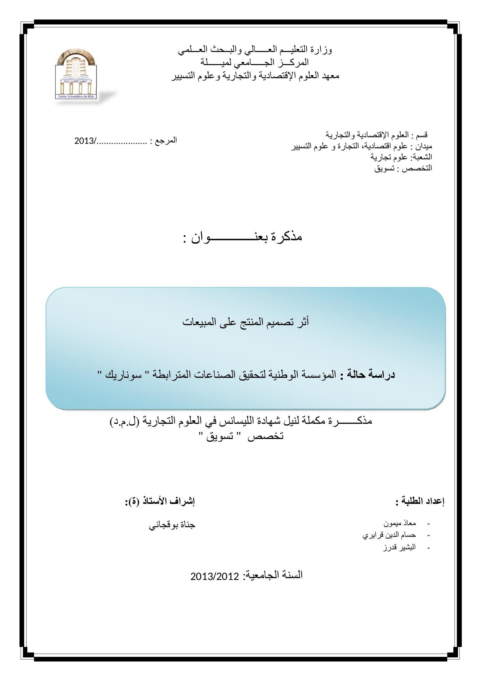 معاذ ميمون & بوقجاني جنات (مشرفا) (2013). أثر تصميم المنتج على المبيعات دراسة حالة مؤسسة سوناريك.
