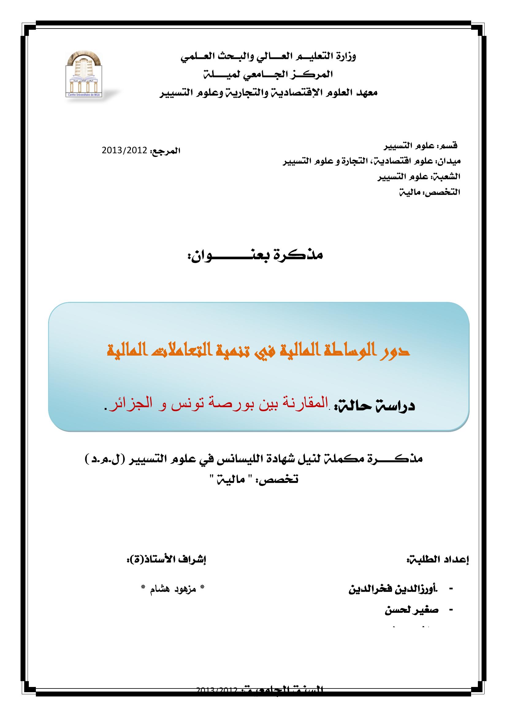 زواغي يوسف & مزهود هشام(مشرفا) (2013). دور الوساطة المالية في تنمية التعاملات المالية دراسة حالة المقارنة بين بورصة تونس والجزائر.