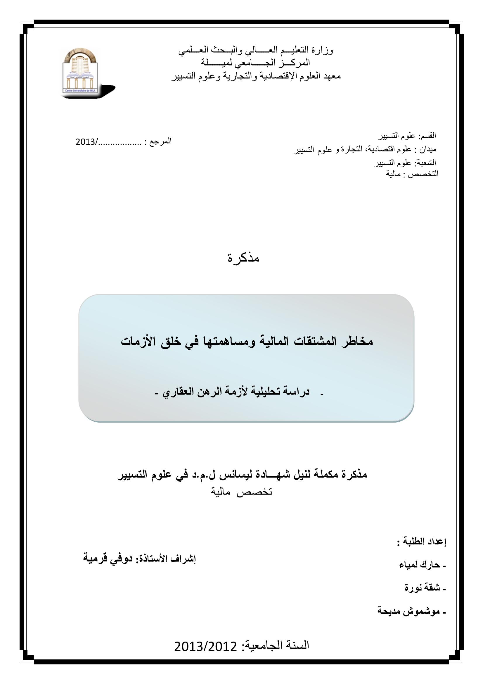 حارك لمياء & دوفي قرمية(مشرفا) (2013). مخاطر المشتقات المالية ومساهمتها في خلق الأزمات دراسة تحليلية لأزمة الرهن العقاري.
