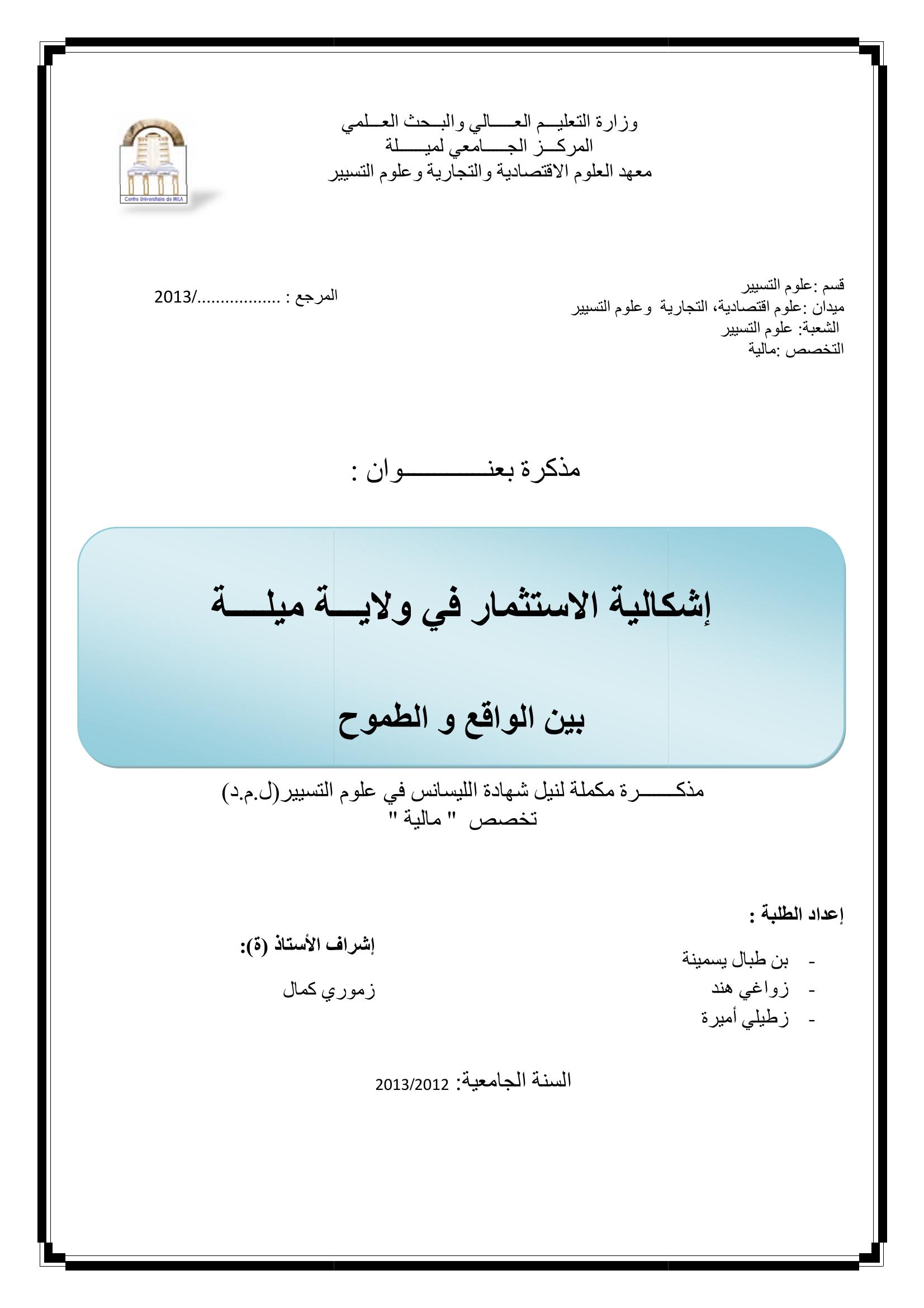 بن طبال يسمينة & زموري كمال (مشرفا) (2013). إشكالية الاستثمار في ولاية ميلة بين الواقع والطموح.