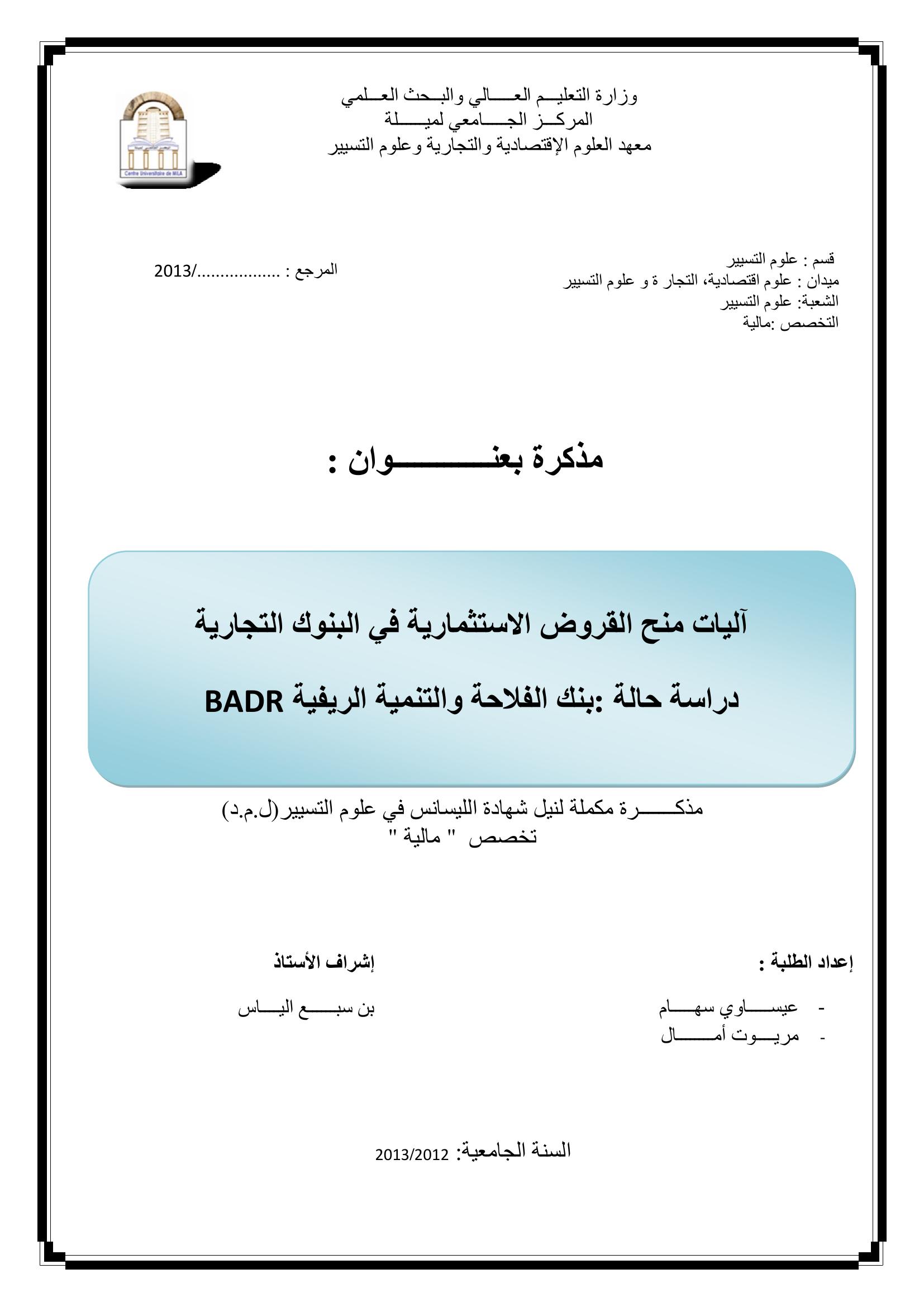 عيساوي سهام (مشرفا) & بن سبع إلياس(مشرفا) (2013). أليات منح القروض الاستثمارية في البنوك التجارية دراسة حالة بنك الفلاحة والتنمية الريفية - ميلة -.