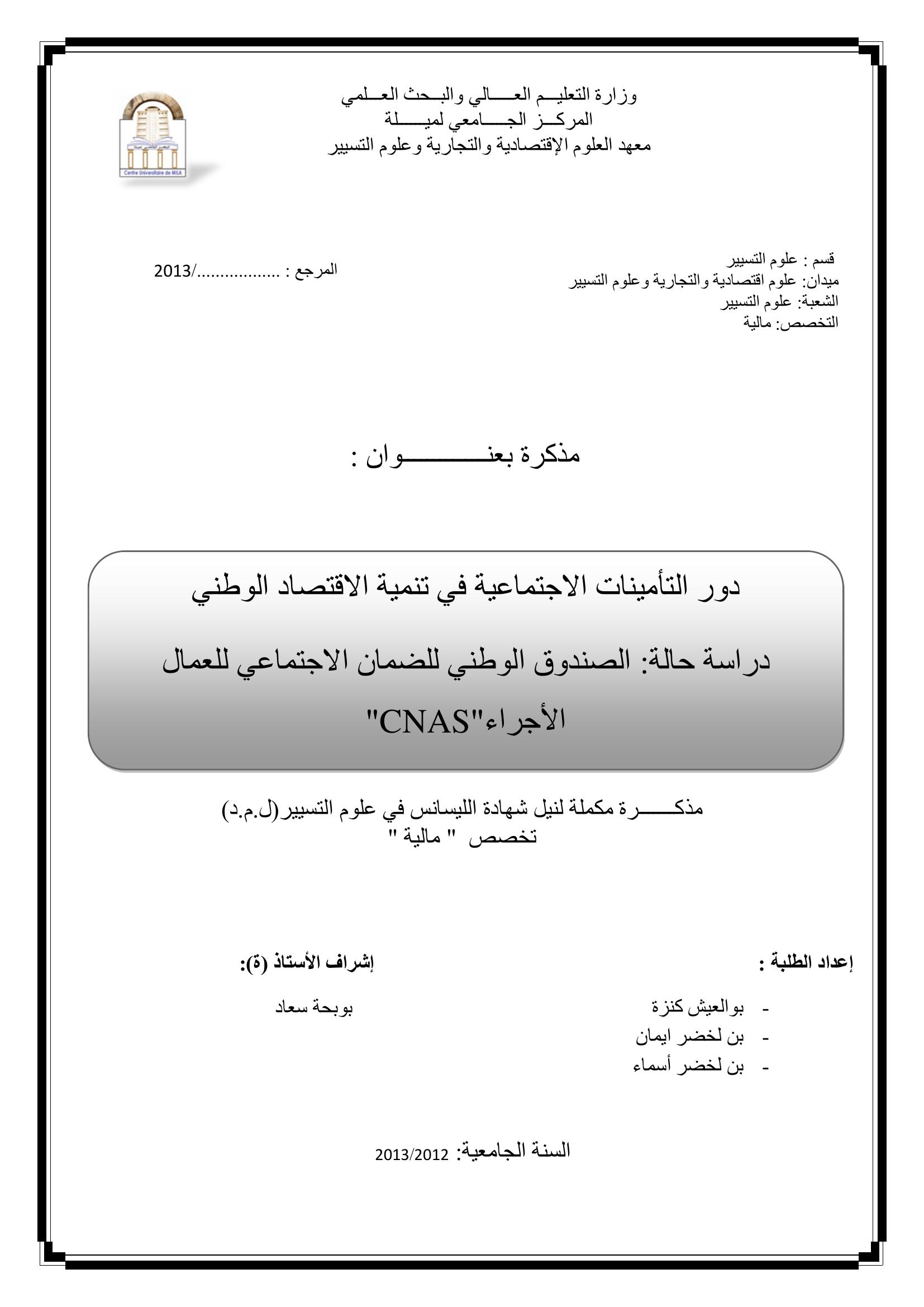 بوالعيش كنزة & بوبحة سعاد(مشرفا) (2013). دور التأمينات الاجتماعية في تنمية الاقتصاد الوطني دراسة حالة CNAS.