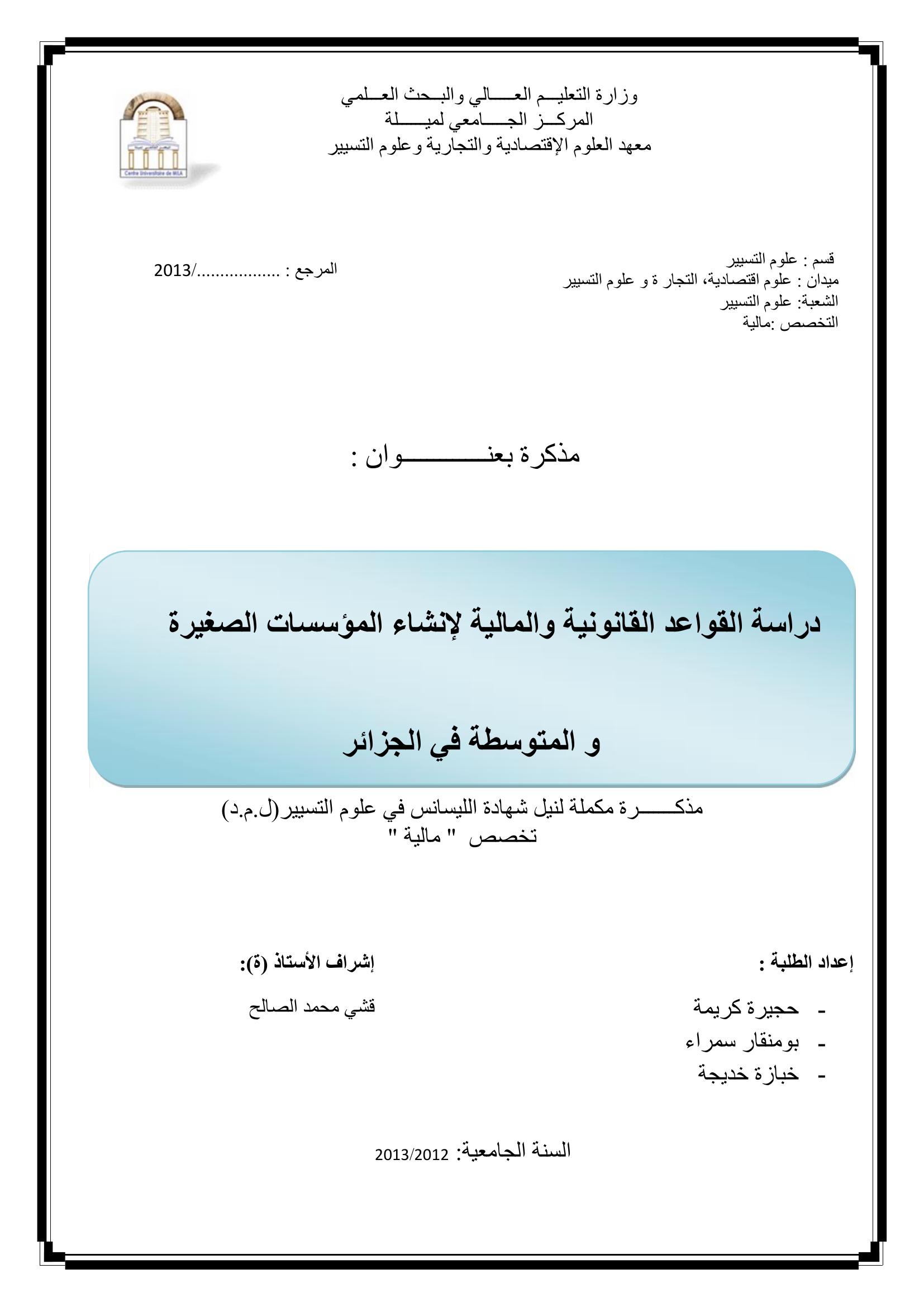 خبازة خديجة & قشي محمد الصالح(مشرفا) (2013). دراسة القواعد القانونية والمالية لإنشاء المؤسسات الصغيرة والمتوسطة في الجزائر.