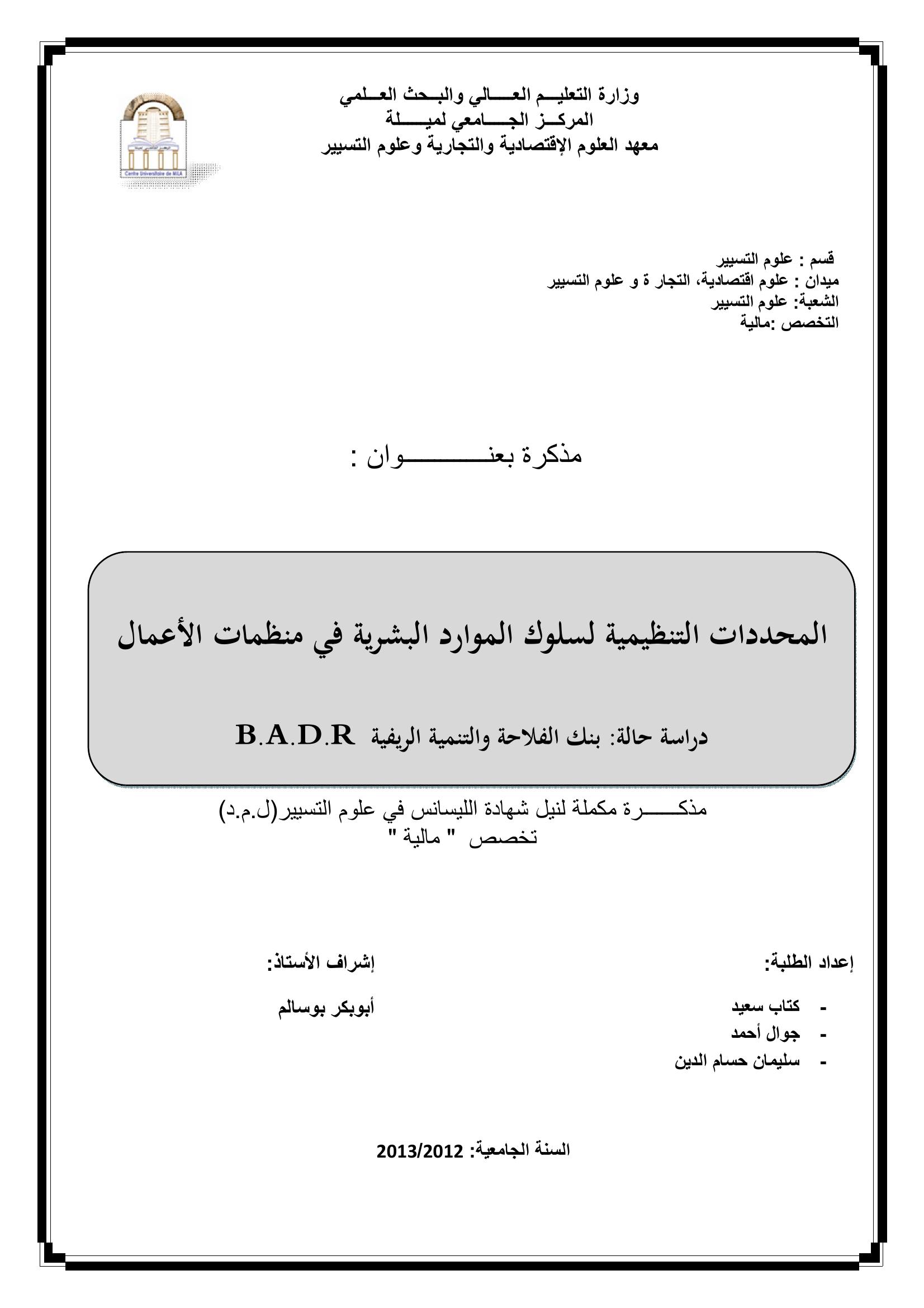 كتاب السعيد & أبوبكر بوسالم(مشرفا) (2013). المحددات التنظيمية لسلوك الموارد البشرية في منظمات الأعمال دراسة حالة بنك الفلاحة والتنمية الريفية - ميلة -.