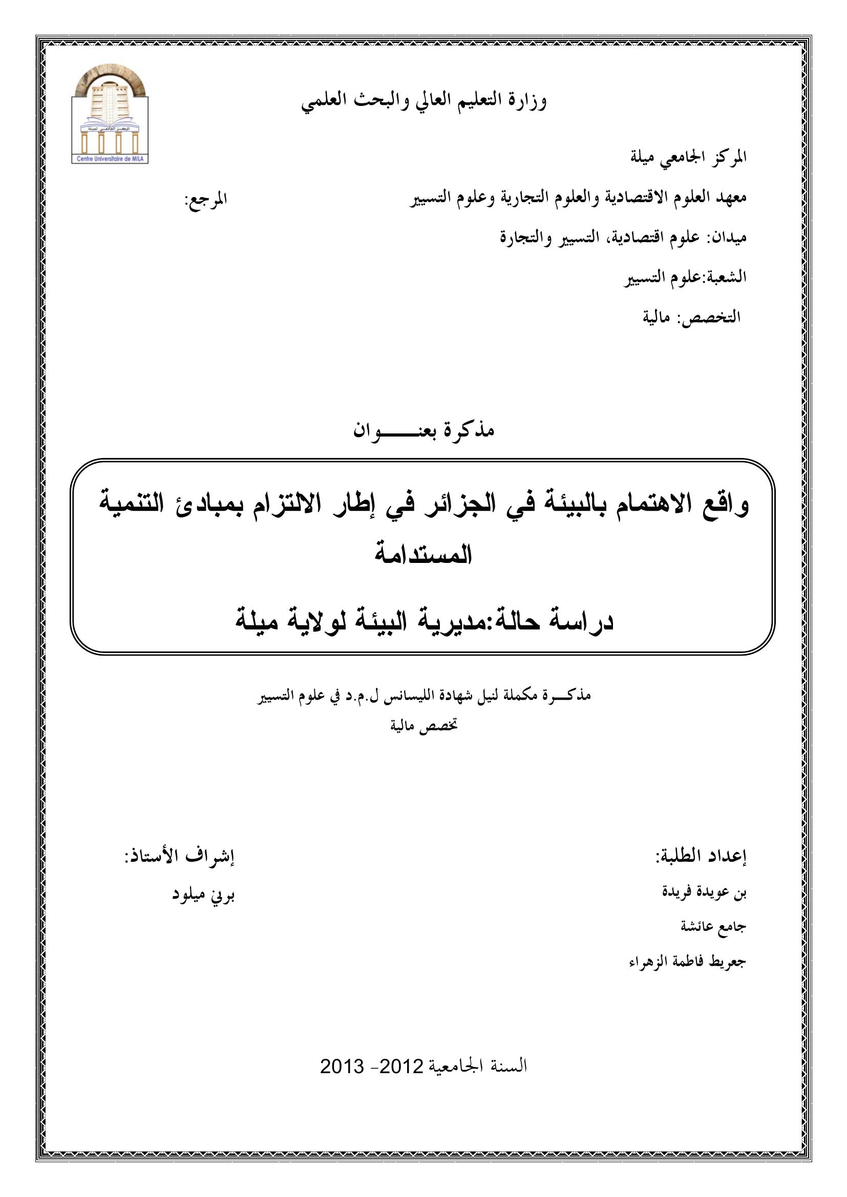 بن عويدة فريدة & برني ميلود (مشرفا) (2013). واقع الاهتمام في الجزائر في إطار الالتزام بمبادئ التنمية المستدامة دراسة حالة مديرية البيئة لولاية ميلة.