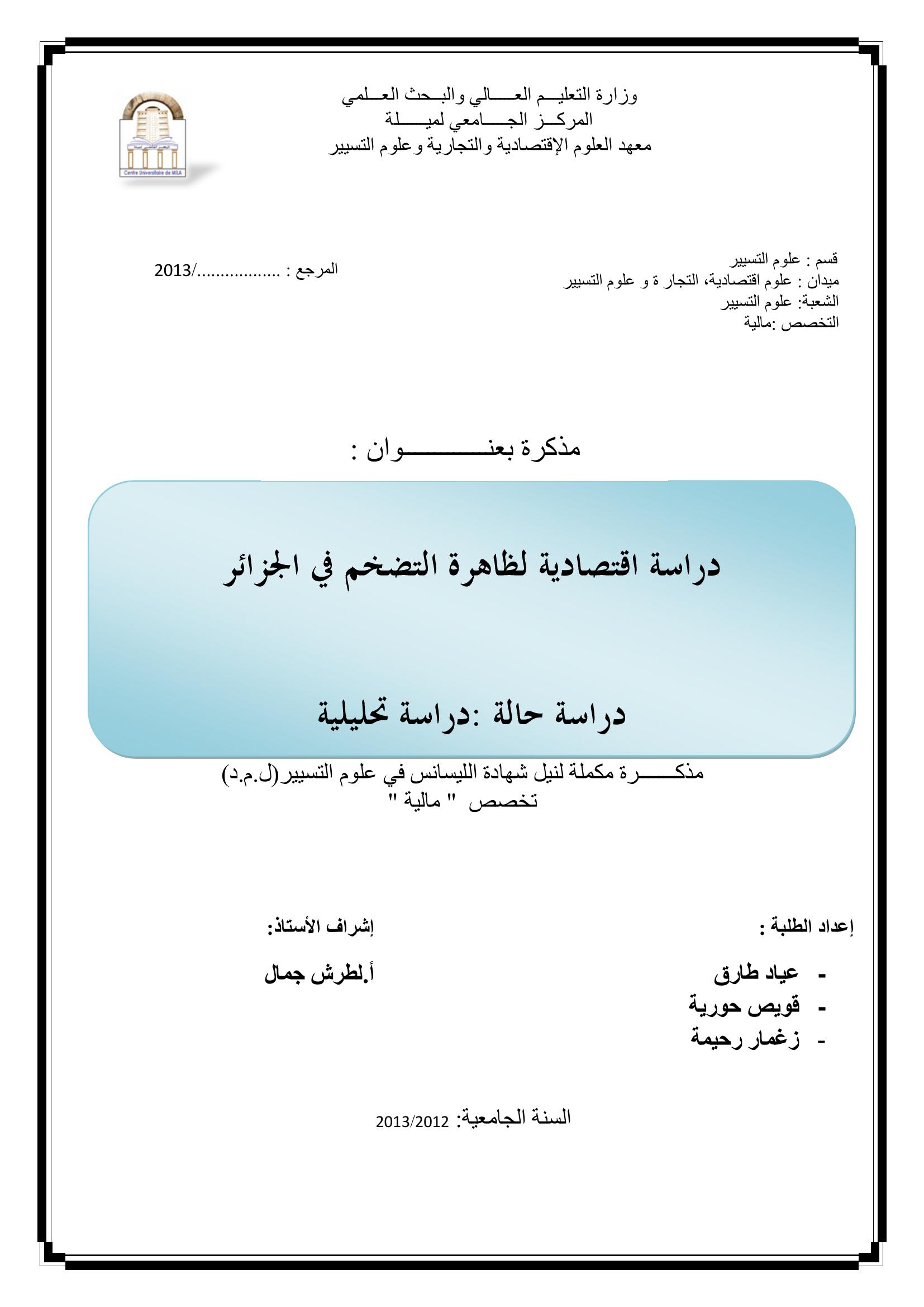 عياد طارق & لطرش جمال(مشرفا) (2013). دراسة اقتصادية لظاهرة التضخم في الجزائر دراسة حالة دراسة تحليلية.