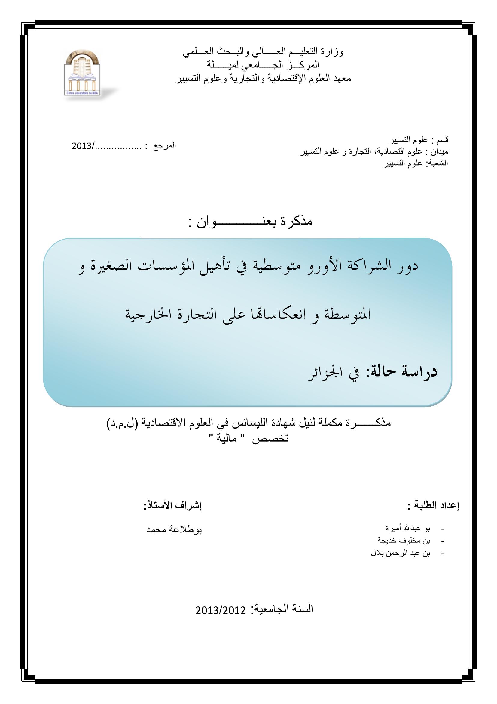بوعبد الله أميرة & بوطلاعة محمد (مشرفا) (2013). دور الشراكة الأورو متوسطية في تأهيل المؤسسات الصغيرة والمتوسطة وانعكاساتها على التجارة الخارجية دراسة حالة الجزائر.