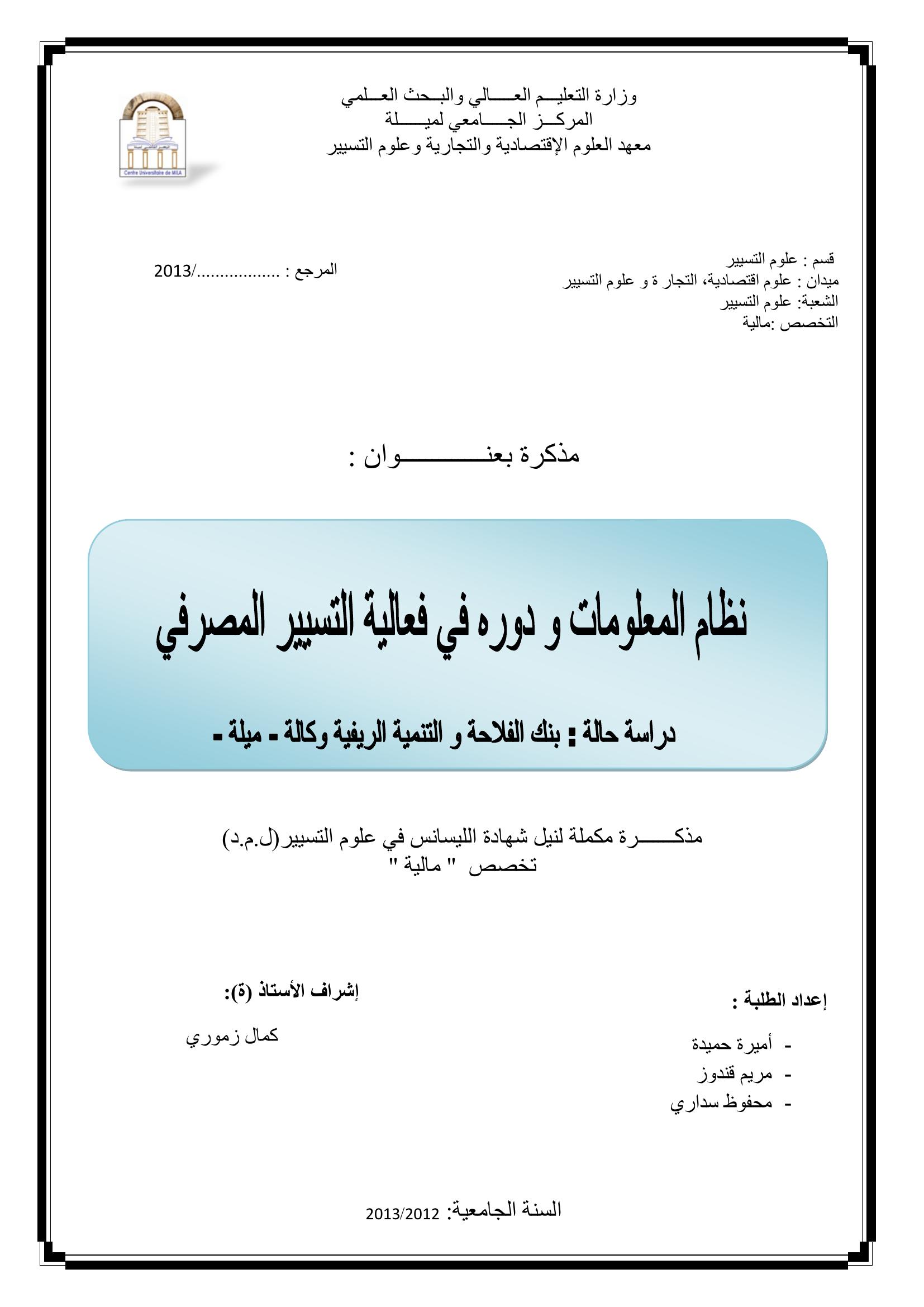 أميرة حميدة et al. (2013). نظام المعلومات ودوره في فعالية التسيير المصرفي دراسة حالة بنك الفلاحة والتنمية الريفية - ميلة -.