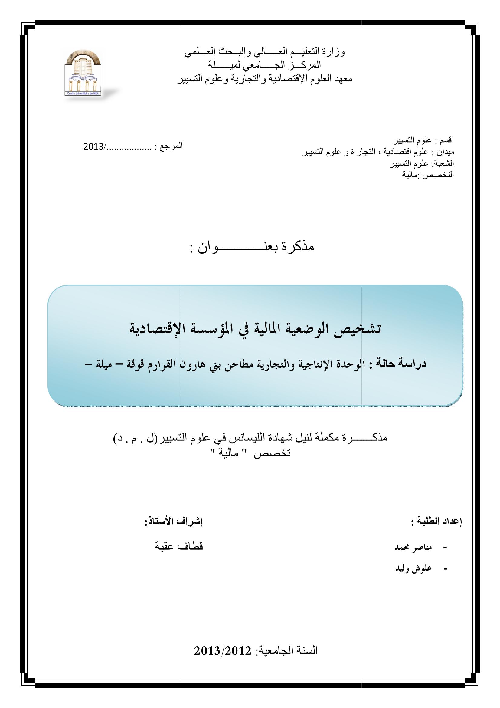 مناصر محمد & قطاف عقبة(مشرفا) (2013). تشخيص الوضعية المالية للمؤسسة الإقتصادية دراسة حالة مطاحن بني هارون - القرارم قوقة -.