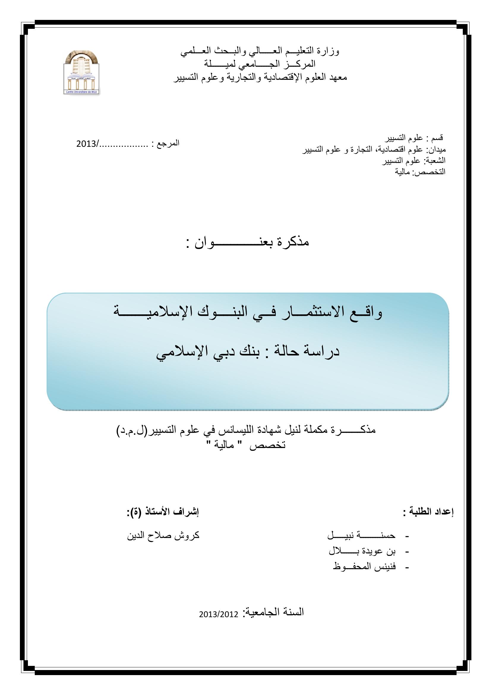 حسنة نبيل & كروش صلاح الدين(مشرفا) (2013). واقع الاستثمار في البنوك الإسلامية دراسة حالة بنك دبي الإسلامي.