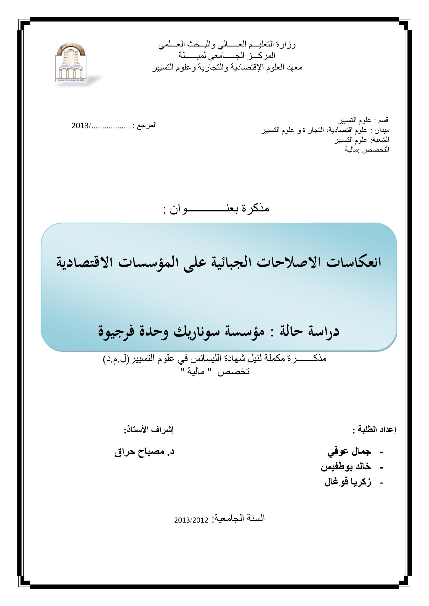 جمال عوفي & حراق مصباح (مشرفا) (2013). انعكاسات الاصلاحات الجبائية على المؤسسات الاقتصادية دراسة حالة مؤسسة سوناريك - فرجيوة -.