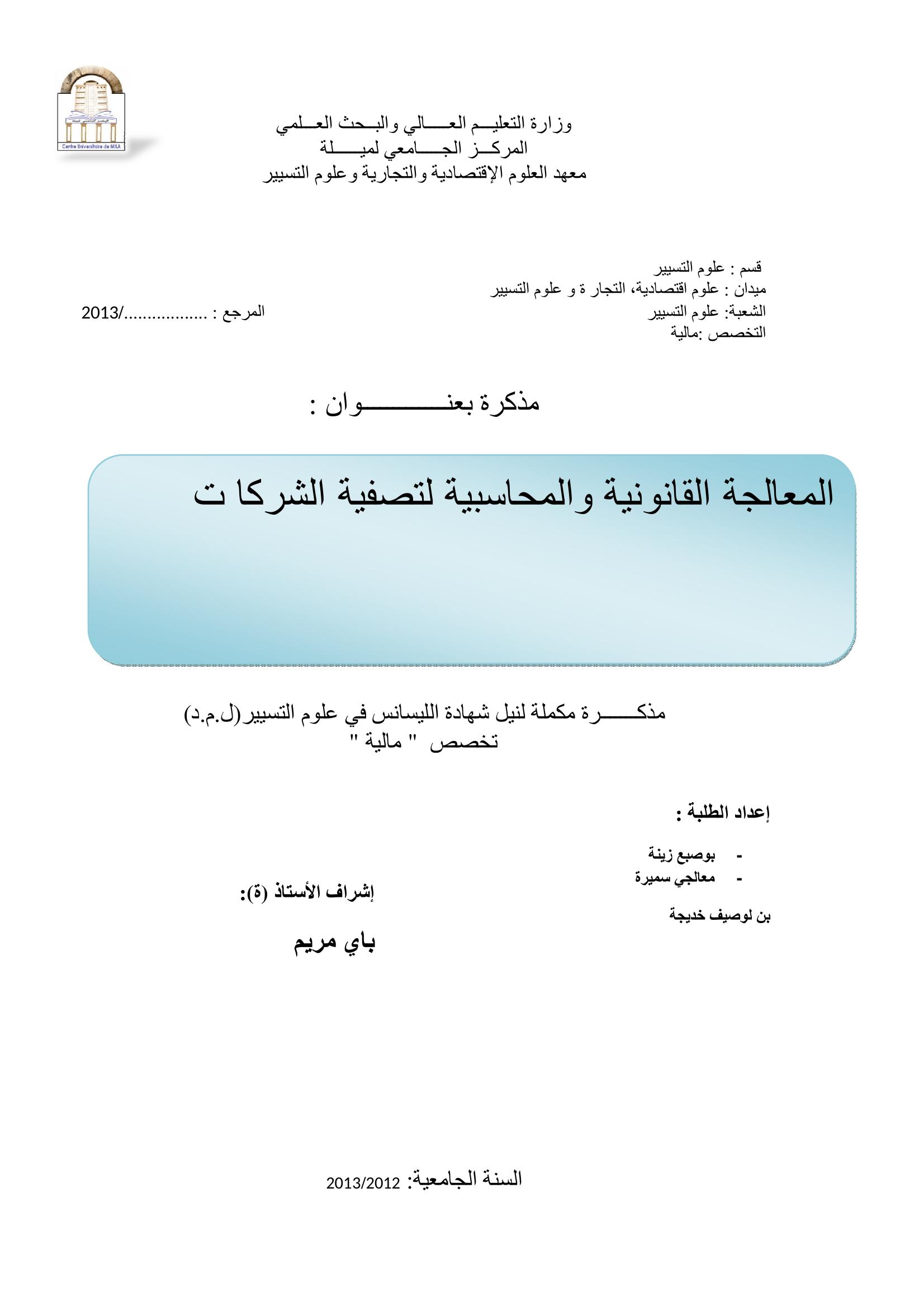 بوصيع زينة & باي مريم (مشرفا) (2013). المعالجة القانونية والمحاسبية لتصفية الشركات.