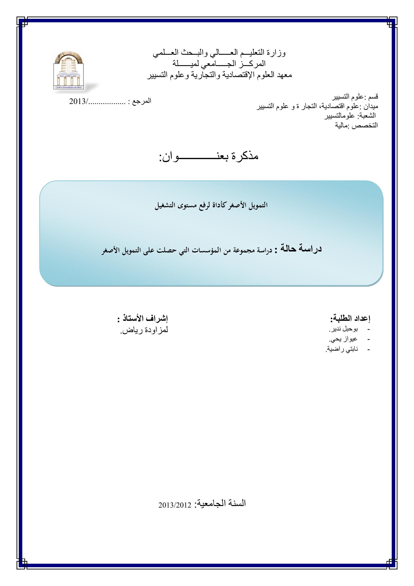 بوحبل ندير & لمزاودة رياض (مشرفا) (2013). التمويل الأصغر كأداة لرفع مستوى التشغيل دراسة حالة مجموعة من المؤسسات التي حصلت على التمويل الأصغر.