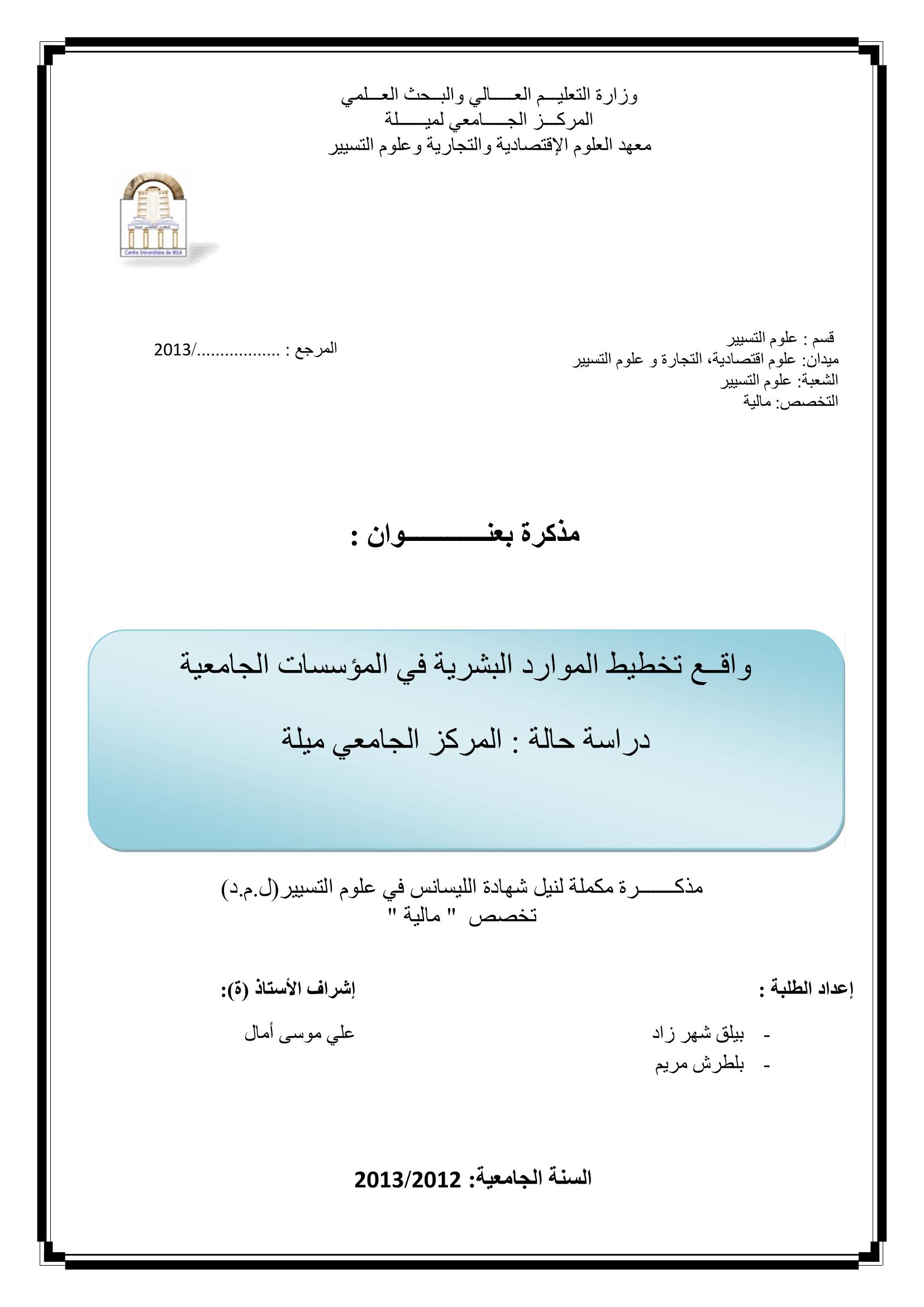 بيلق شهرزاد & علي موسى أمال (مشرفا) (2013). واقع تخطيط الموارد البشرية في المؤسسات الجامعية دراسة حالة المركز الجامعي ميلة.