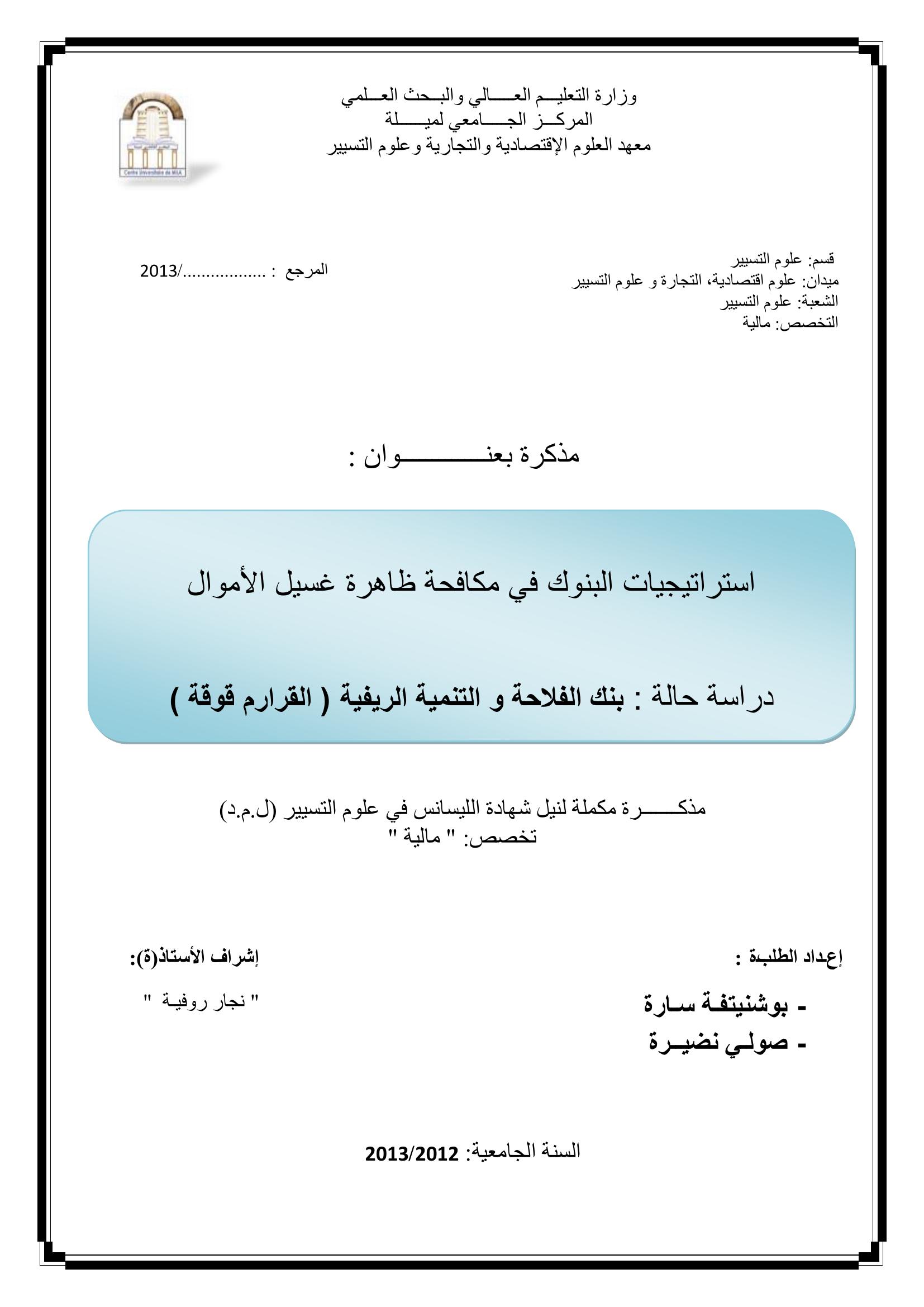 بوشنبتفة سارة & نجار روفية (مشرفا) (2013). استراتيجيات البنوك في مكافحة ظاهرة غسيل الأموال دراسة حالة بنك الفلاحة والتنمية الريفية - القرارم قوقة -.