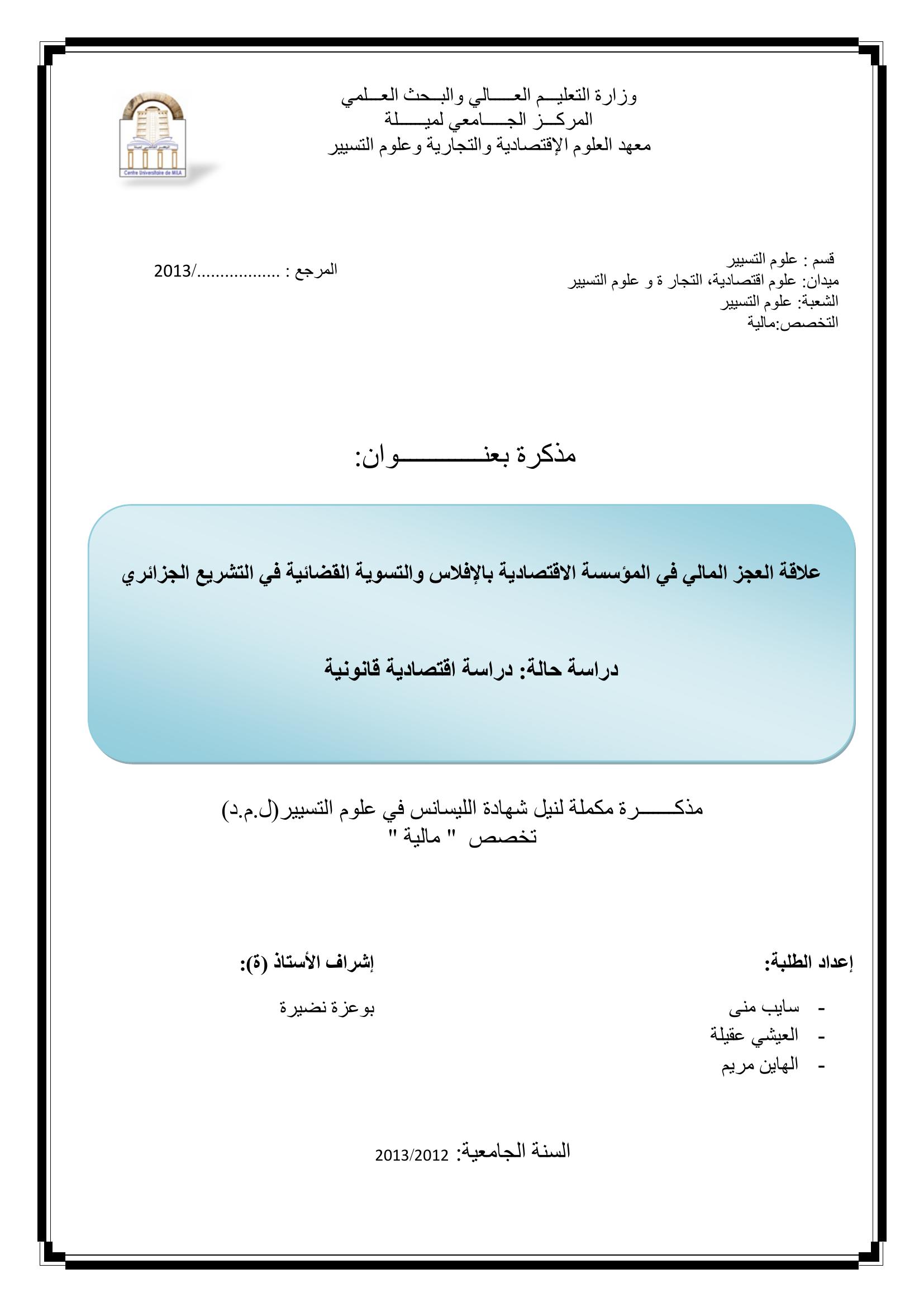سايب منى & بوعزة نظيرة(مشرفا) (2013). علاقة العجز المالي في المؤسسة الاقتصادية بالإفلاس والتسوية القضائية في التشريع الجزائري.