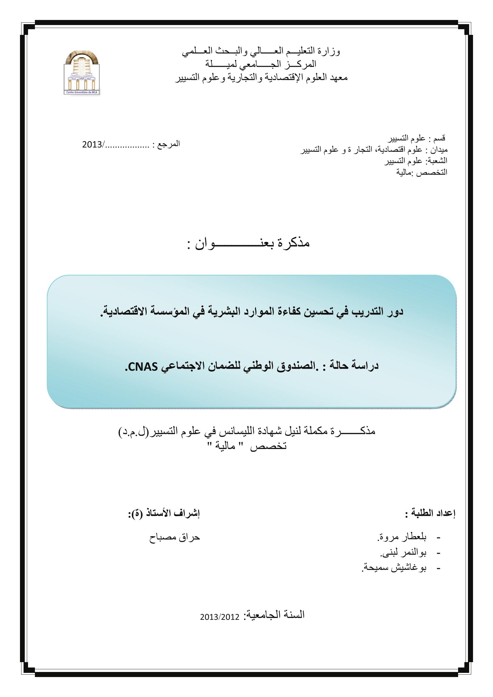 بلعطار مروة & حراق مصباح (مشرفا) (2013). دور التدريب في تحسين كفاءة الموارد البشرية في المؤسسة الاقتصادية دراسة حالة الصندوق الوطني للضمان الاجتماعي CNAS.