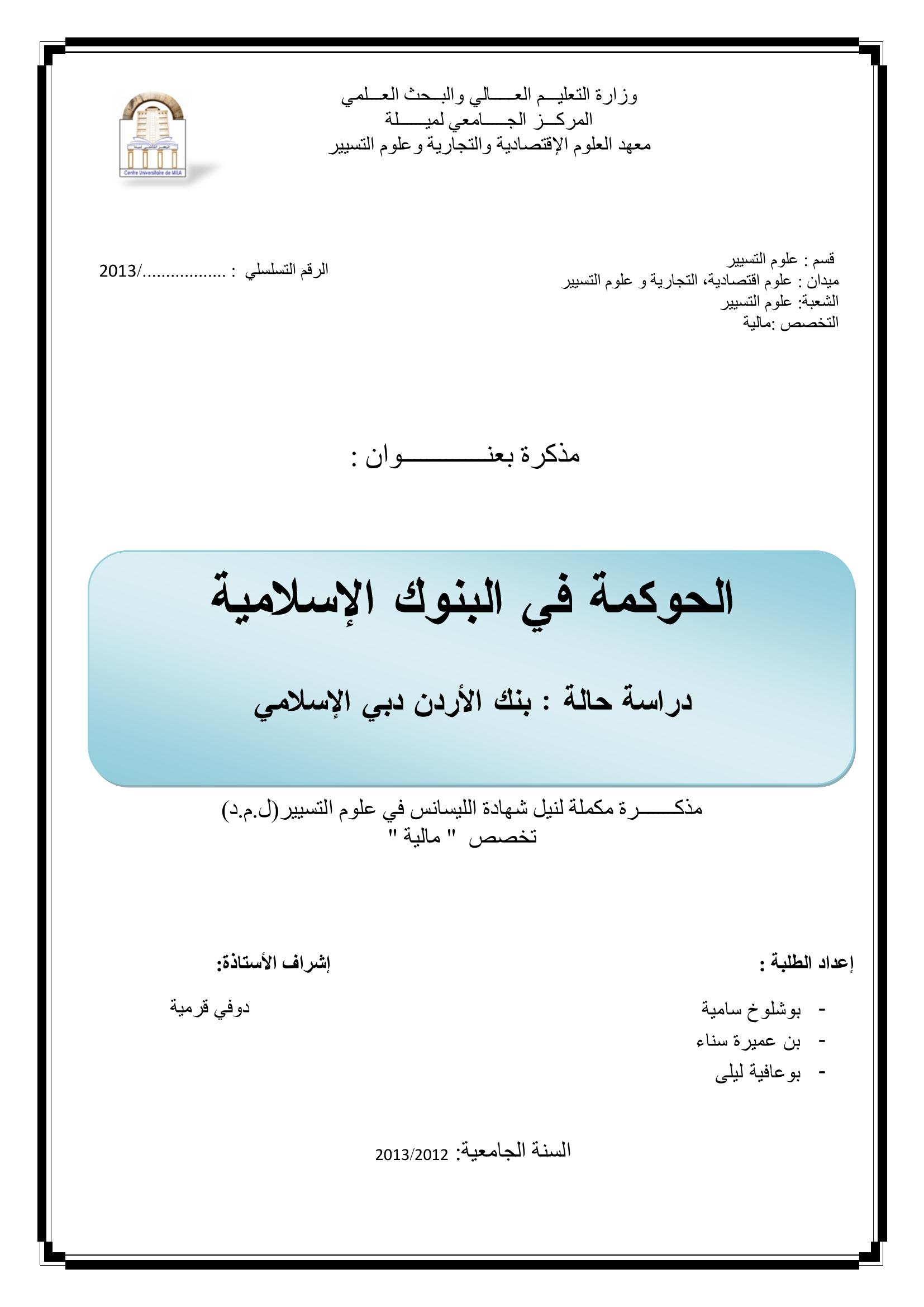 بوشلوخ سامية & دوفي قرمية(مشرفا) (2013). الحوكمة في البنوك الإسلامية دراسة حالة بنك الأردن دبي الإسلامي.