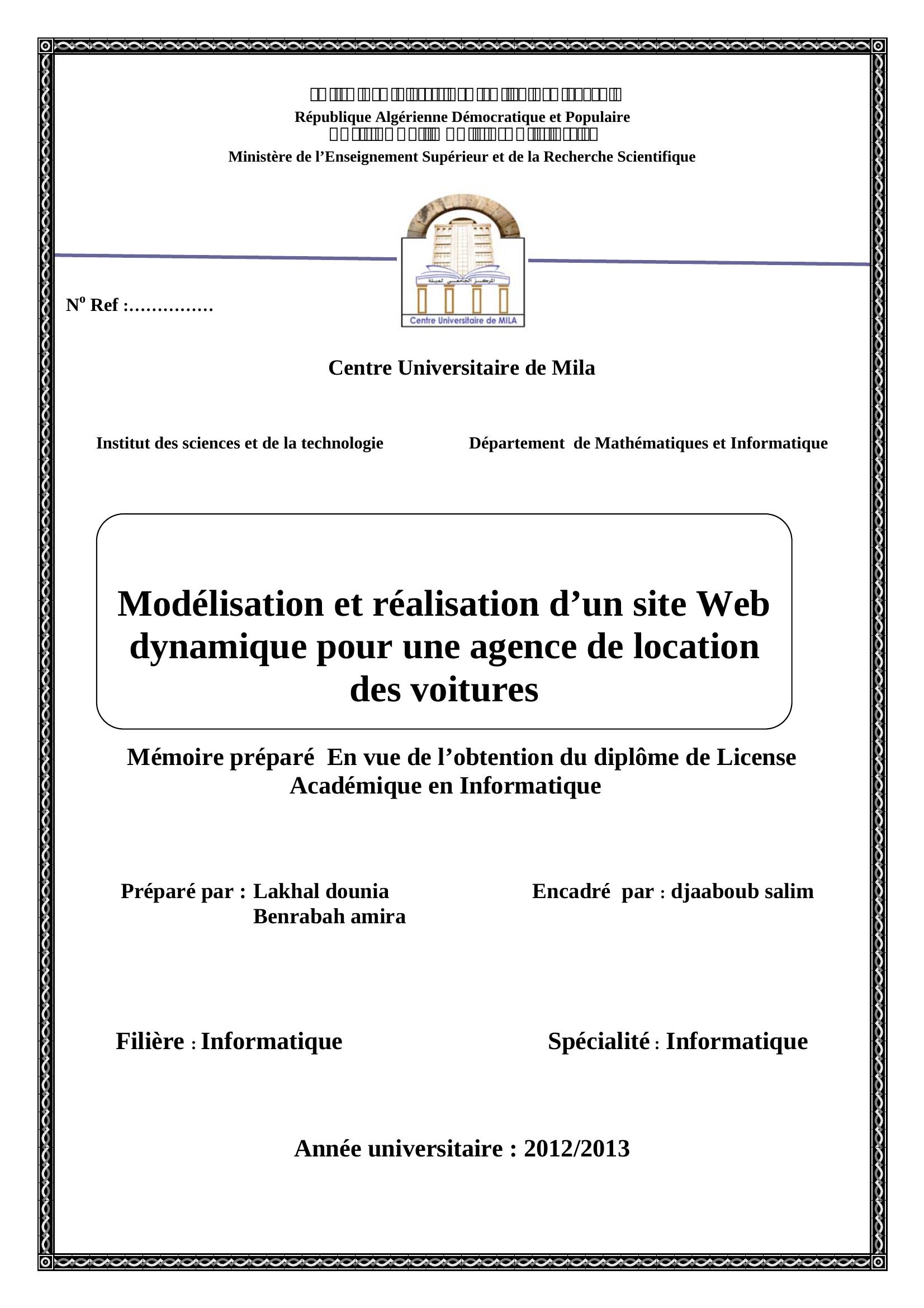 Lakhal dounia & Djaaboub Salim( encadreur) (2013). Modélisation et réalisation d'un site web pour une agence de location des voitures.