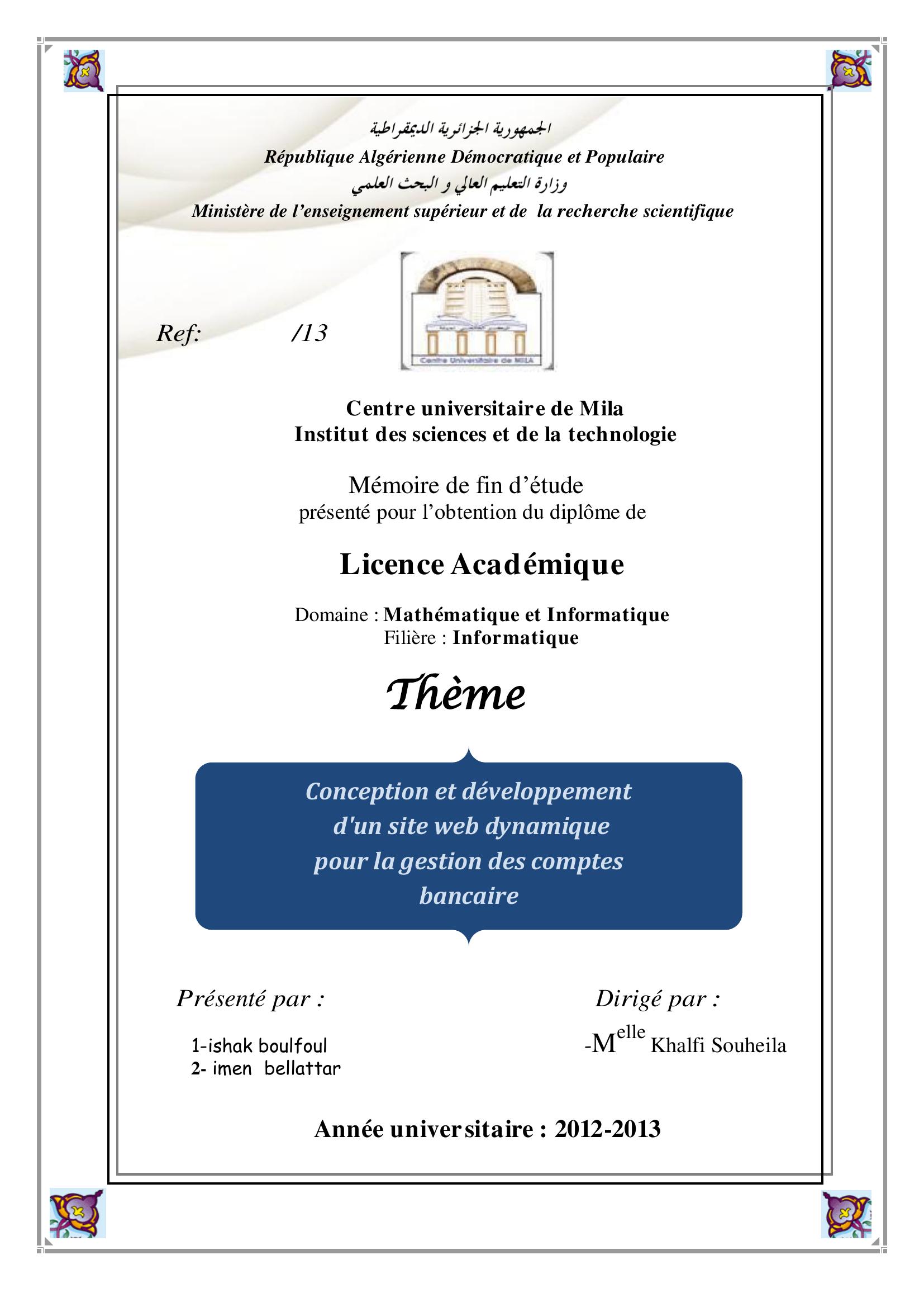 Ishak boulfoul & Khalfi Souheila( encadreur) (2013). Conception et développement d'un site web dynamique pour la gestion des comptes bancaire.