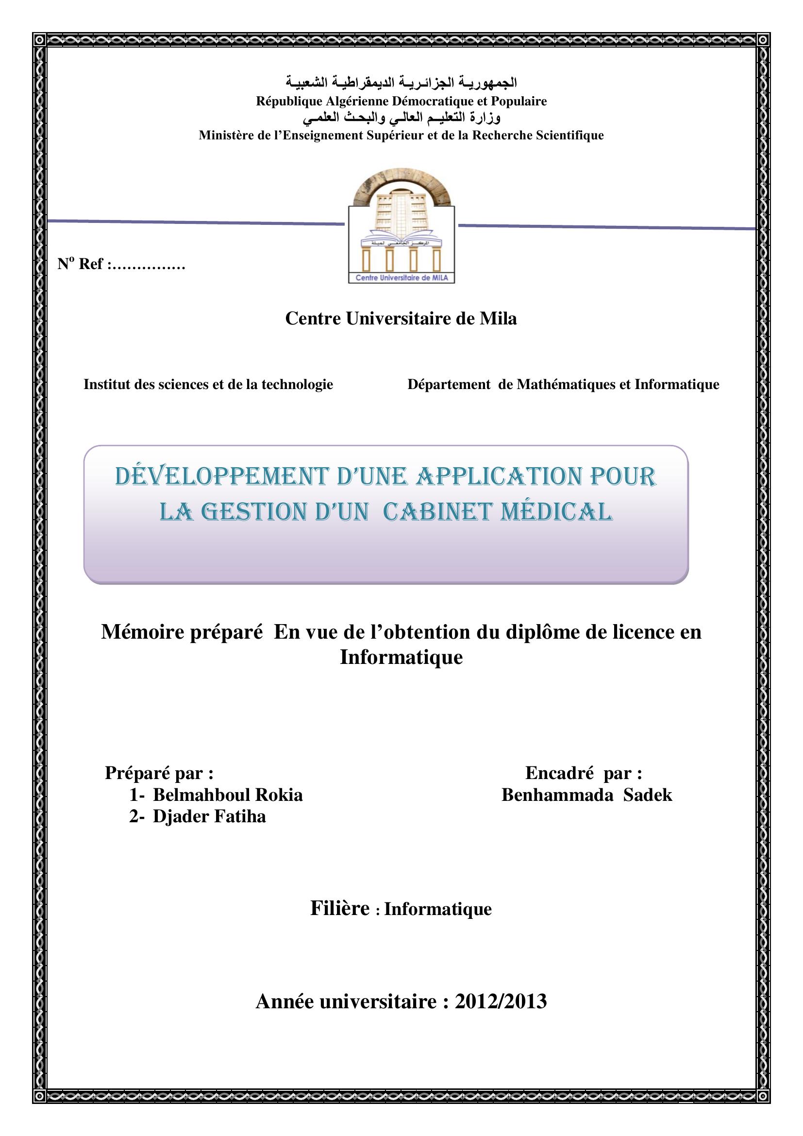 Belmahboul rokia & Benhammada Sadek( encadreur) (2013). Développement d'une application pour la gestion d'un cabinet médical.