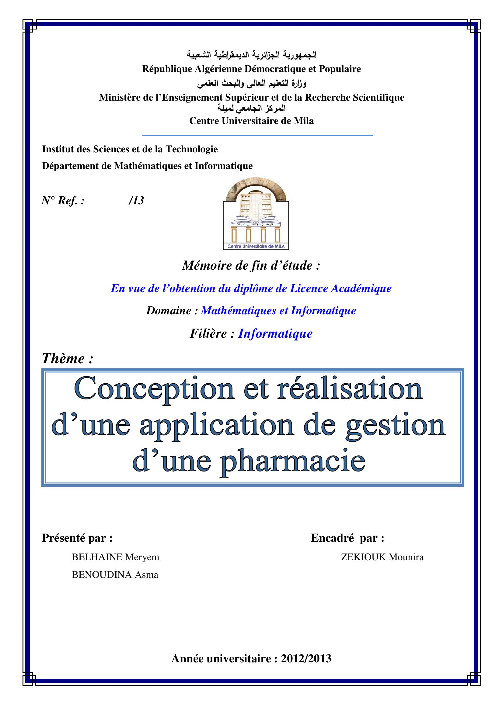 Belhaine Meryem & ZEKIOUK Mounira encadreur (2013). Conception et réalisation d'une application de gestion d'une pharmacie.