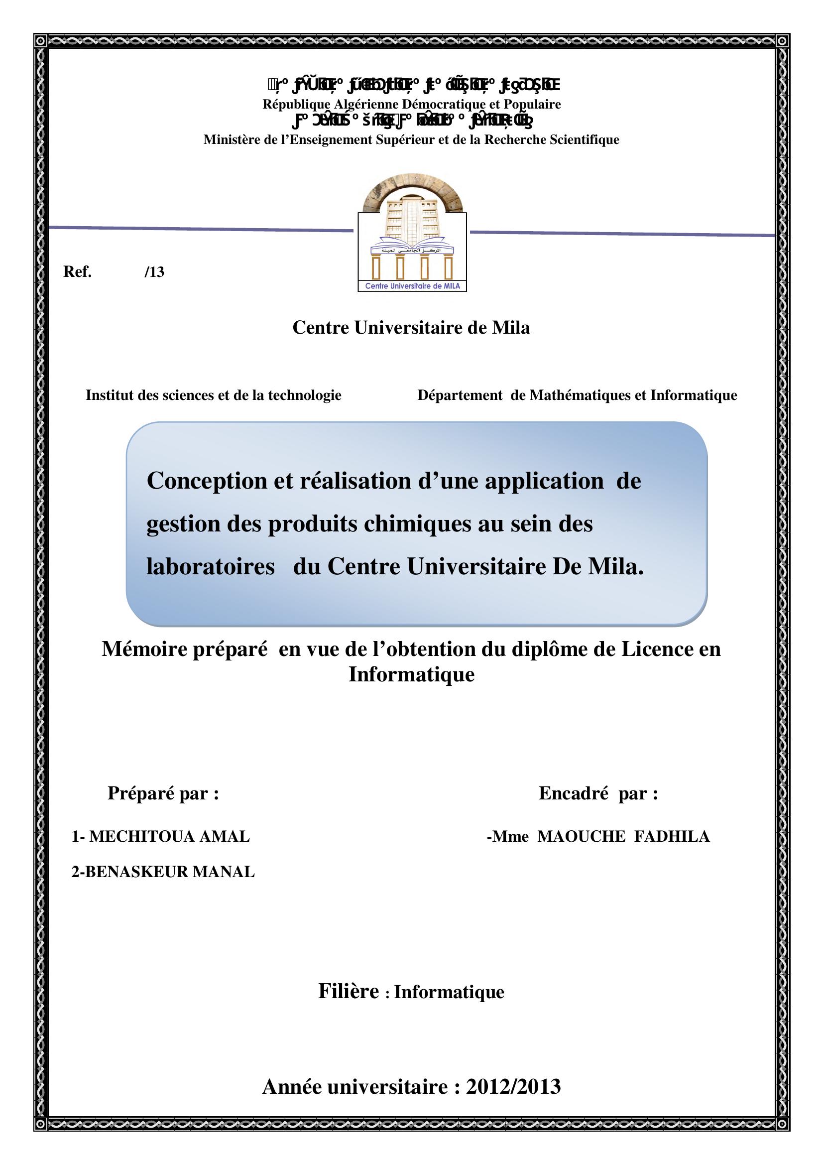 Mechitoua Amal & Maouche fadhila encadreur (2013). Conception et réalisation d'une application de gestion des produits chimiques au sein des laboratoires du centre universitaire de mila.