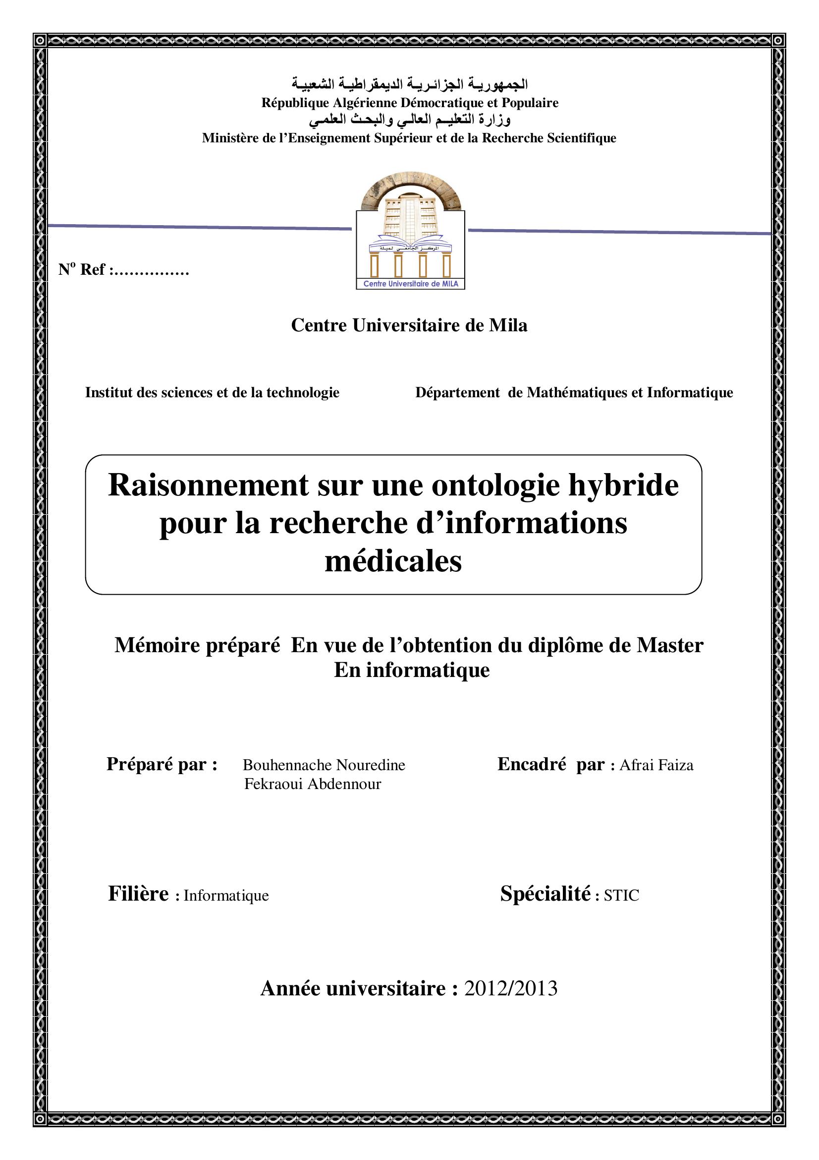 Fekraoui Abdennour & Afrai Faiza encadreur (2013). Raisonnement sur une ontologie hyperide pour la recherche d'informations médicales.