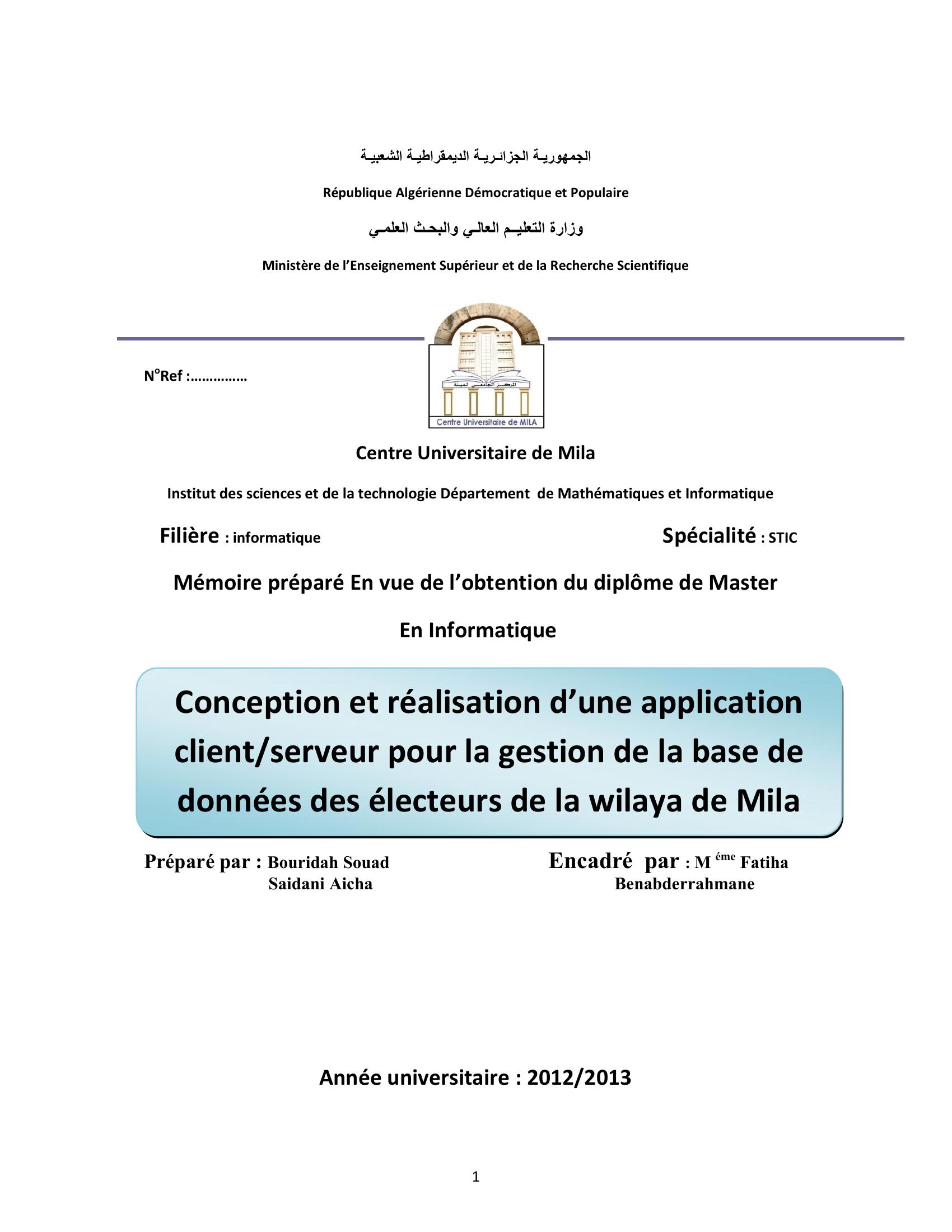 Saidani Aicha & benabderrahmane fatiha encadreur (2013). Conception et réalisation d'une application client serveur pour la gestion de la base de données des électeurs de la wilaya de mila.