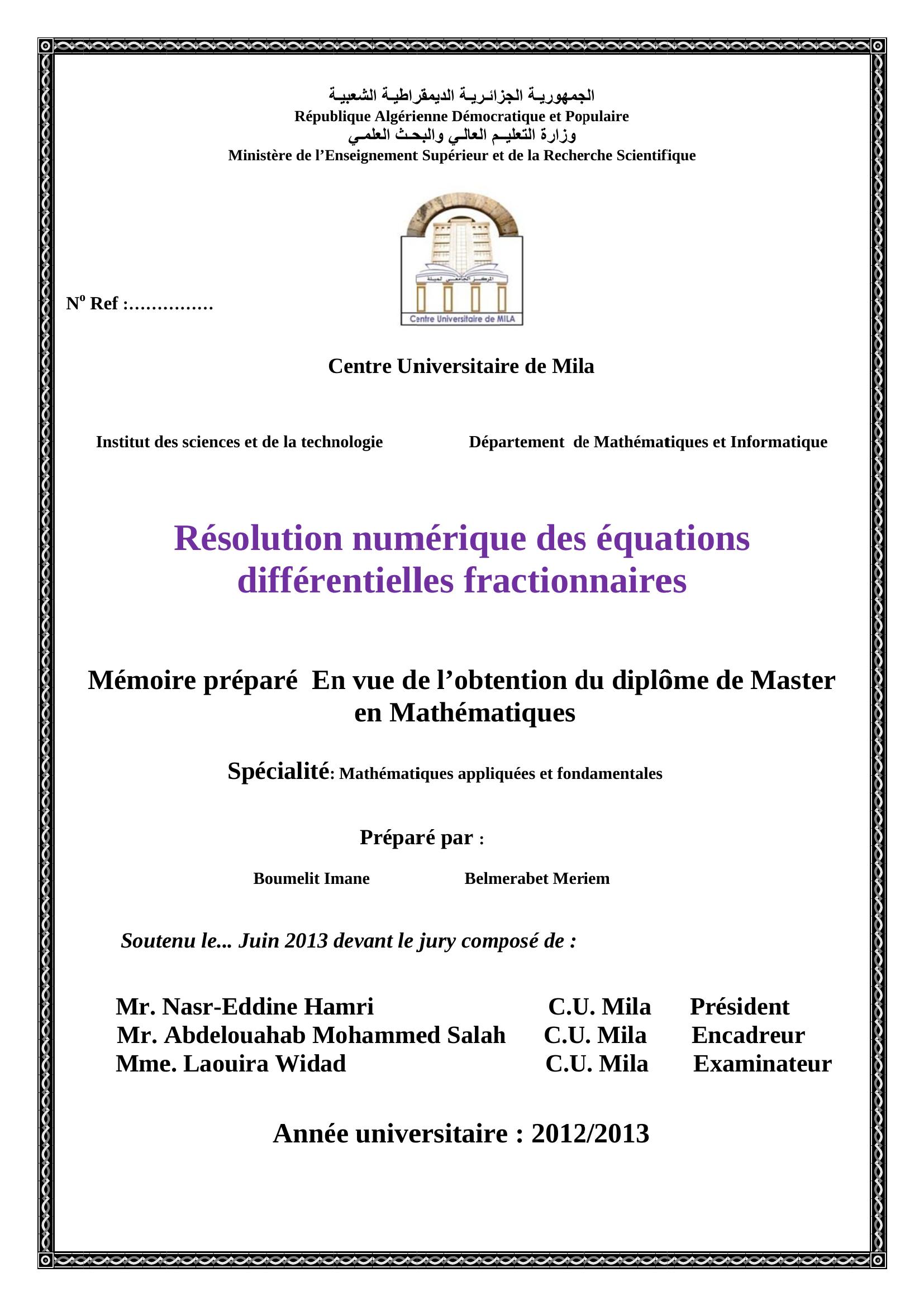Boumelit Imane & nasr eddine hamri président, a. (2013). Résolution numérique des équations différentielles fractionnaires.