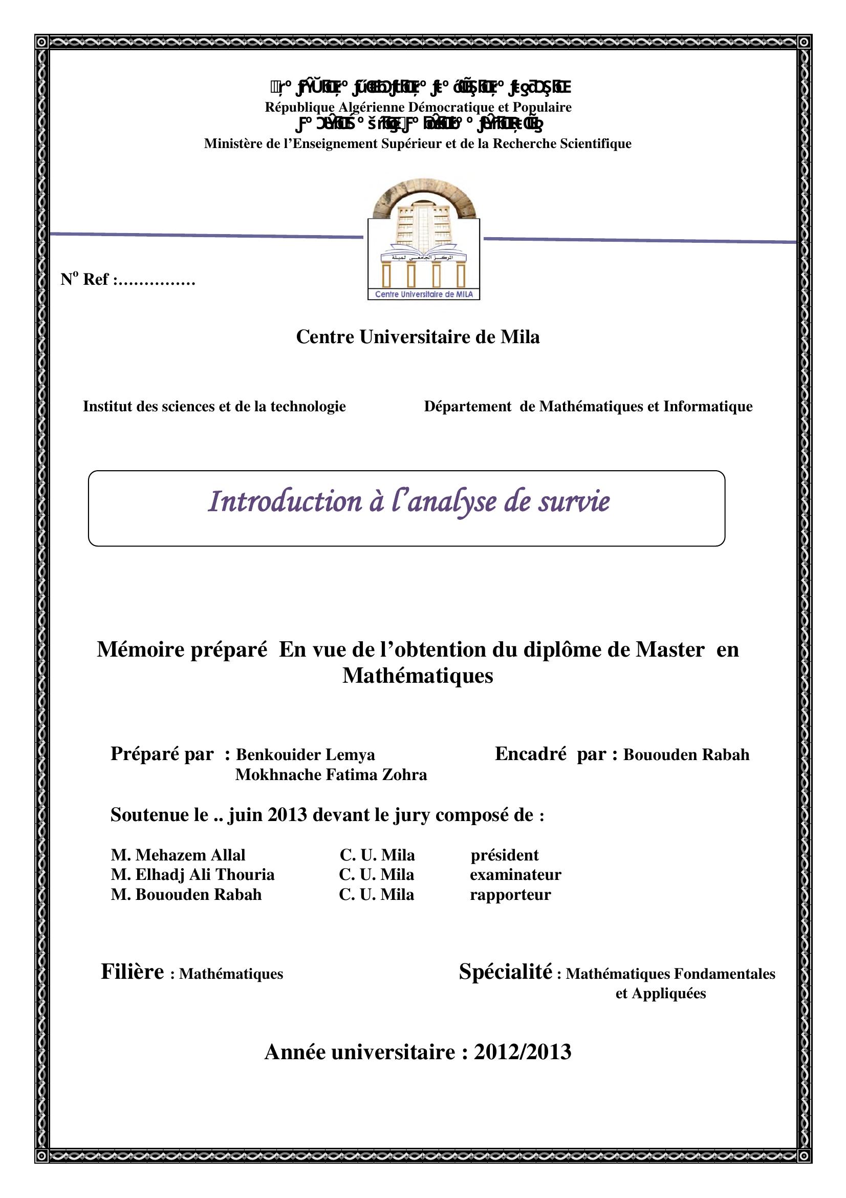 Benkouider Lemya & Bouden Rabah encadreur (2013). Introduction à l'analyse de survie.