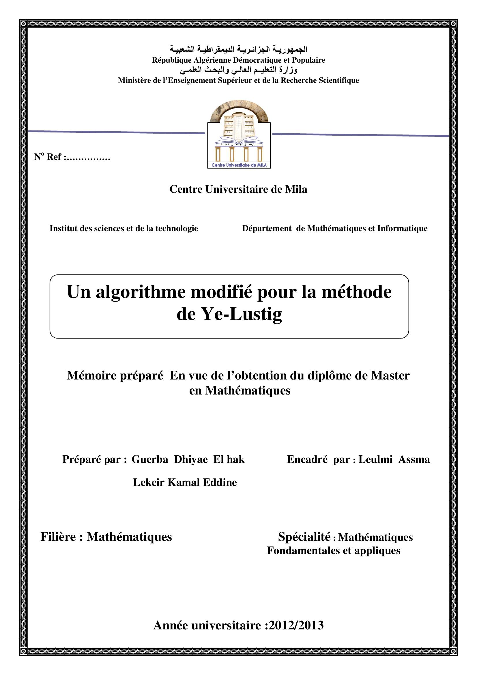 Lekcir Kamal Eddine & Leulmi Assma encadreur (2013). Un algorithme modifiié pour la méthode de ye-lustig.