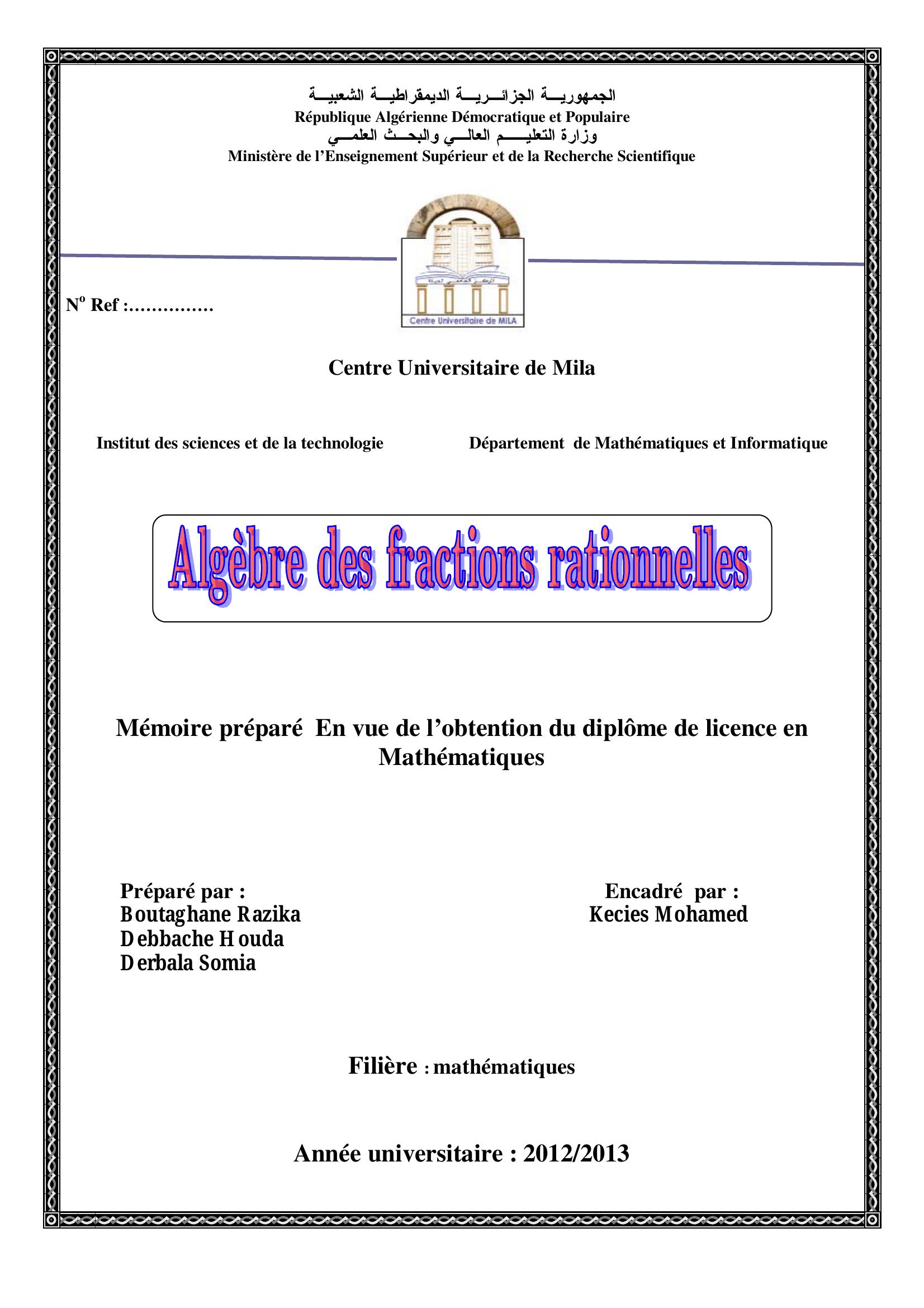 Boutaghane razika & Kecies Mohamed encadreur (2013). Algèbre des fractions rationnelles.