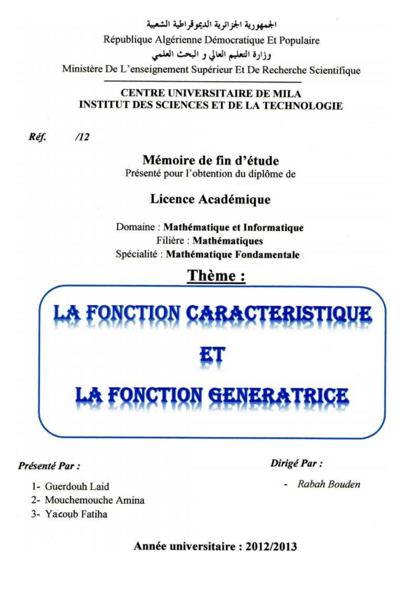 GuerdouhLaid & Bouden Rabah encadreur (2013). La fonction caracteristique et la fonction generatrice.