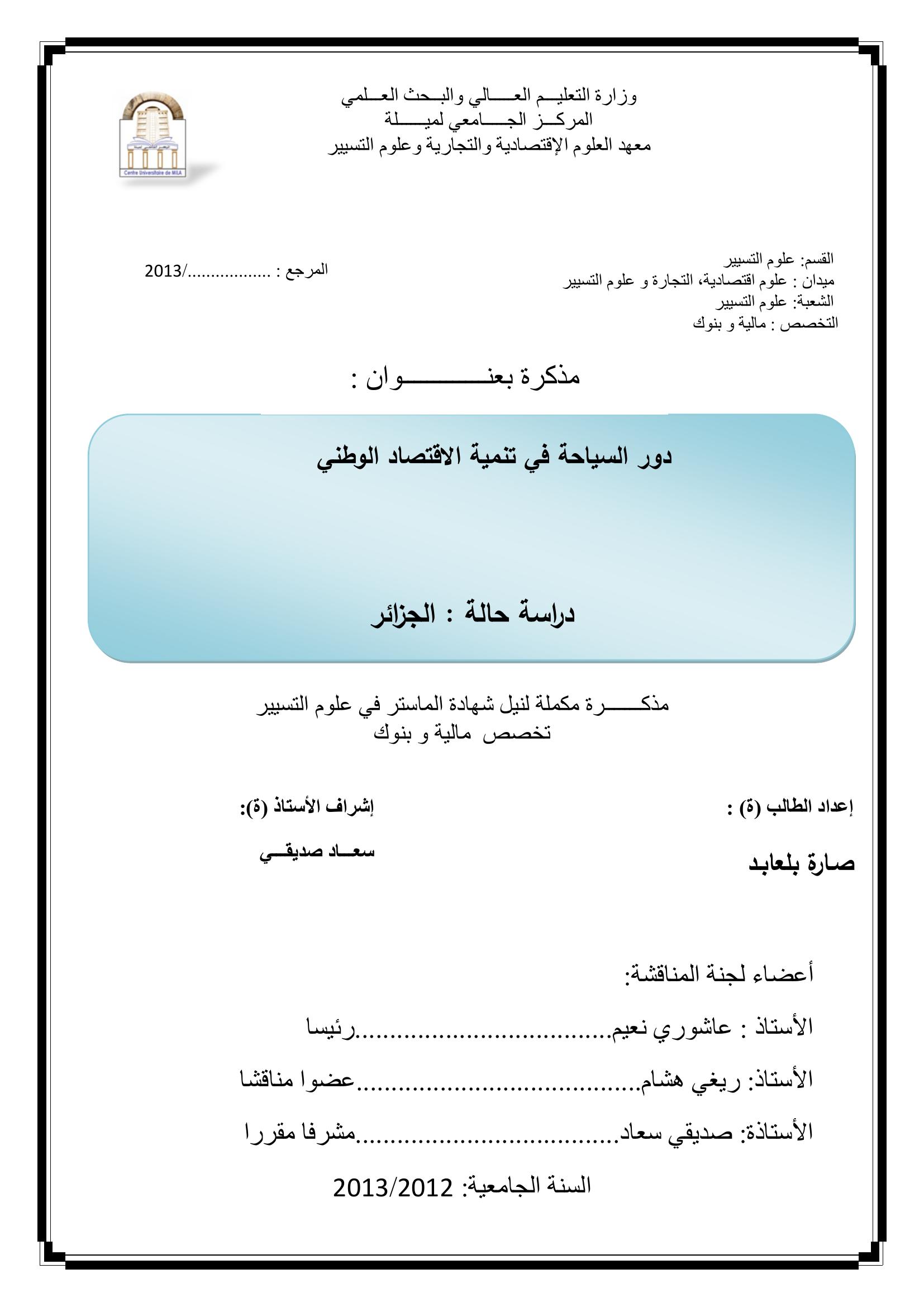 بلعابد صارة & صديقي سعاد(مشرفا) (2013). دور السياحة في تنمية الإقتصاد الوطني دراسة حالة الجزائر.