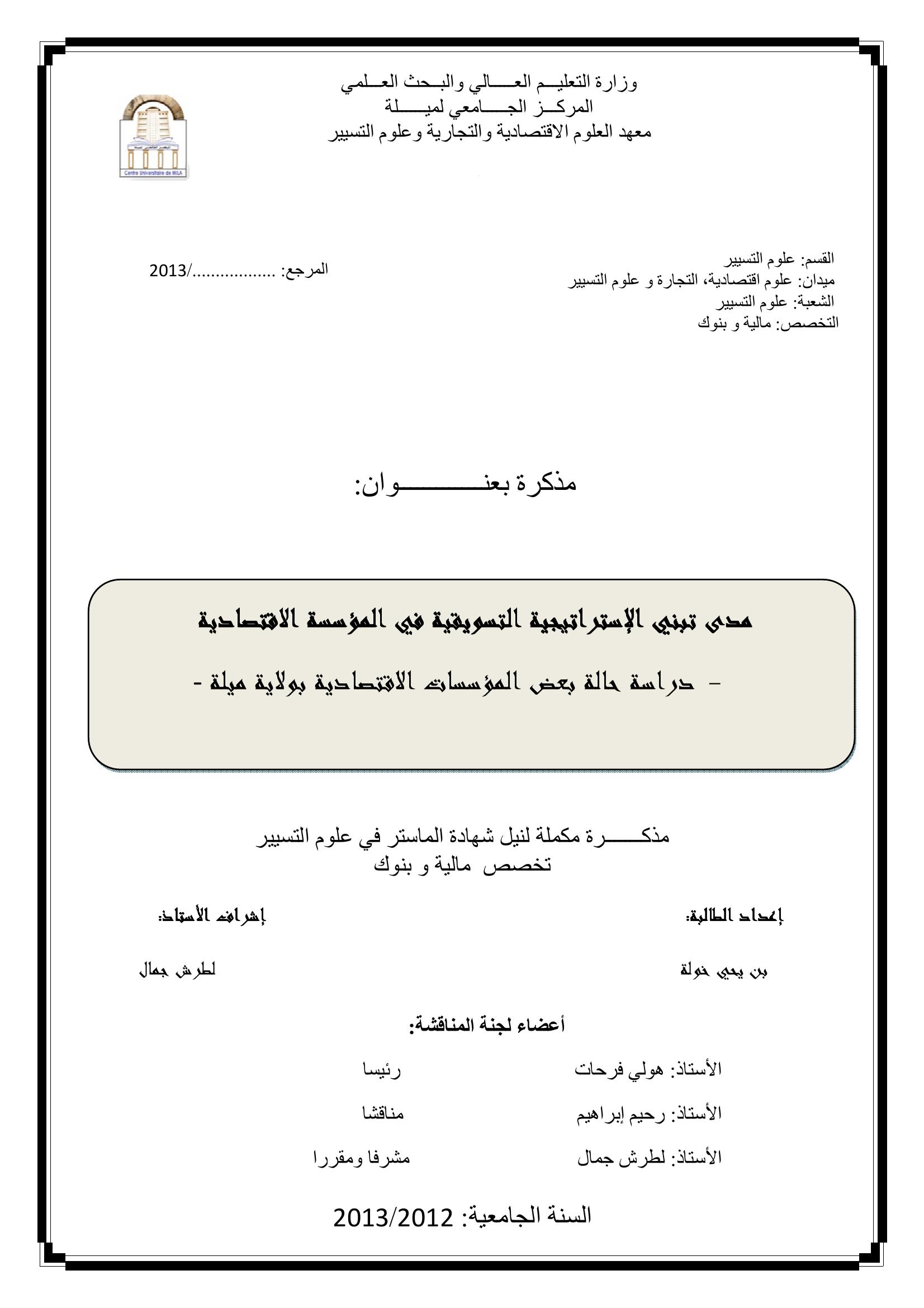 بن يحي خولة & ،هولي فرحات(رئيسا), ق. (2013). مدى تبني الإستراتيجية التسويقية في المؤسسة الإقتصادية دراسة حالة بعض المؤسسات الإقتصادية بولاية ميلة.