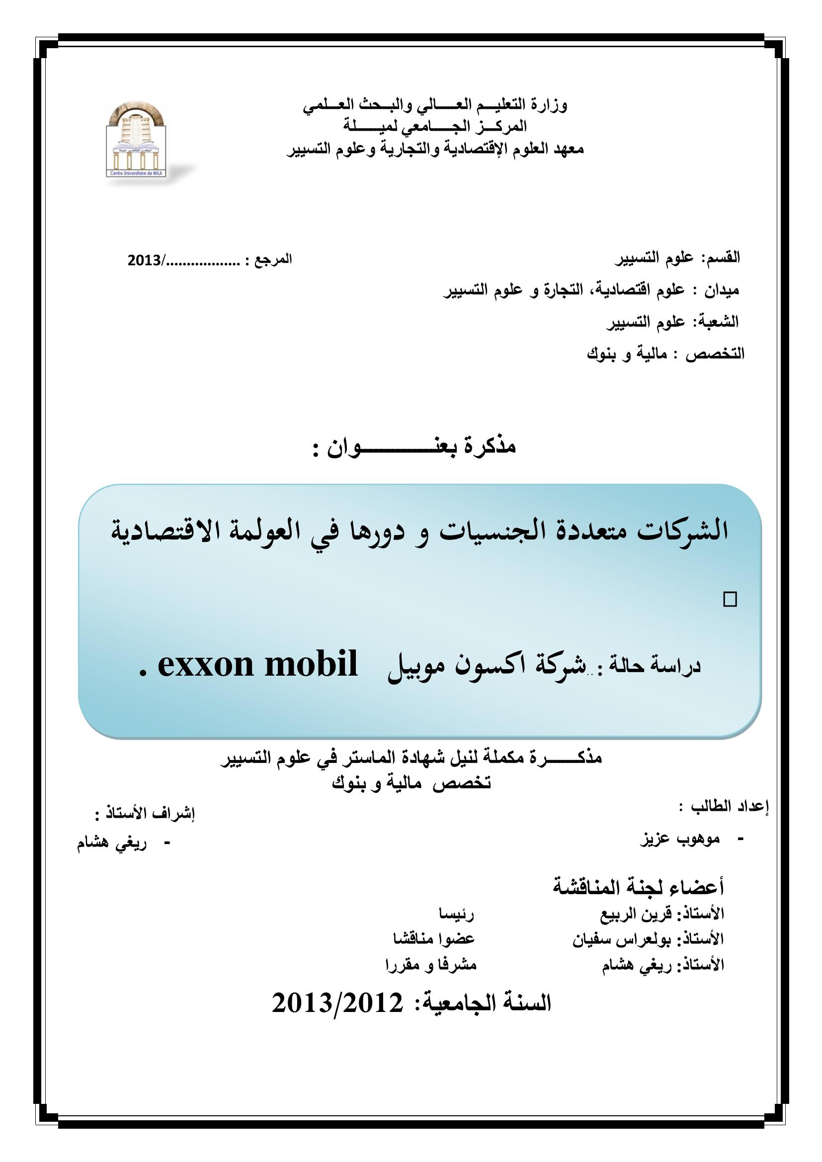موهوب عزيز & , ق. (2013). الشركات المتعددة الجنسيات ودورها في العولمة الاقتصادية دراسة حالة شركة اكسون موبيل EX X ON MOBIL.