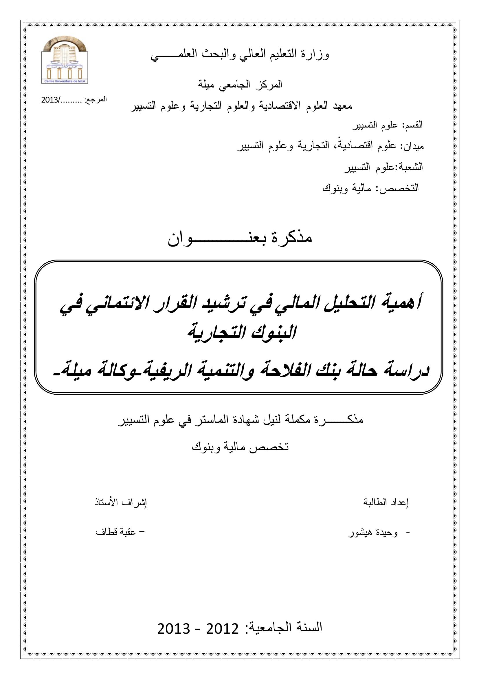 وحيدة هيشور & قطاف عقبة(مشرفا) (2013). أهمية التحليل المالي في ترشيد القرار الا ئتماني في البنوك التجارية دراسة حالة بنك الفلاحة والتنمية الريفية -وكالة ميلة-.