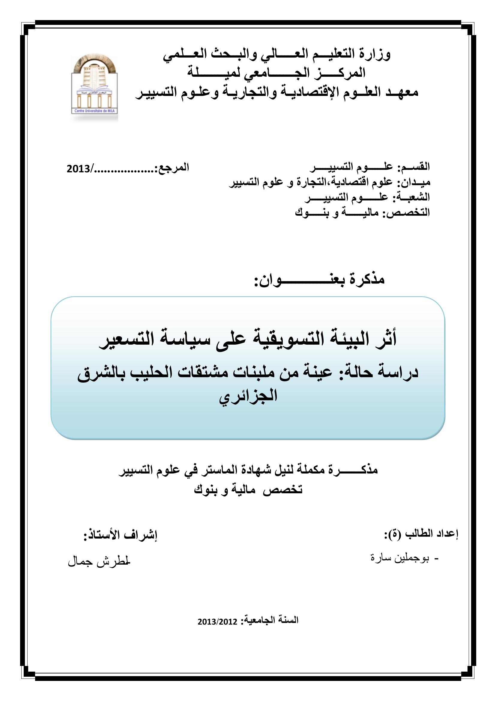 لطرش جمال(مشرفا) (2013). أثر البيئة التسويقية على سياسة التسعير دراسة حالة عينة من ملبنات مشتقات الحليب بالشرق الجزائري.