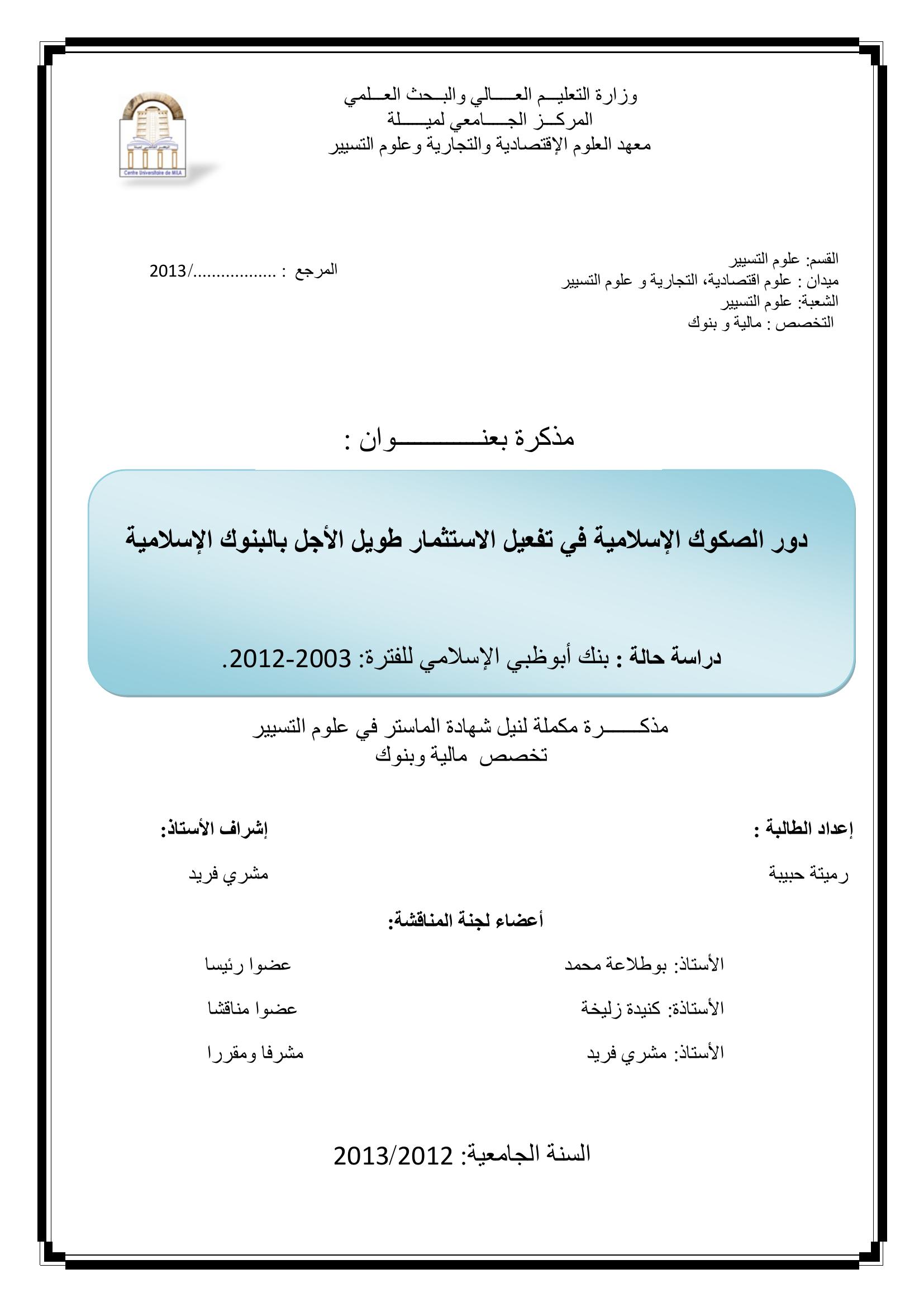دور الصكوك الإسلامية في تفعيل الاستثمار طويل الأجل بالبنوك الإسلامية دراسة حالة أبوظبي الإسلامي للفترة : 2003-2012