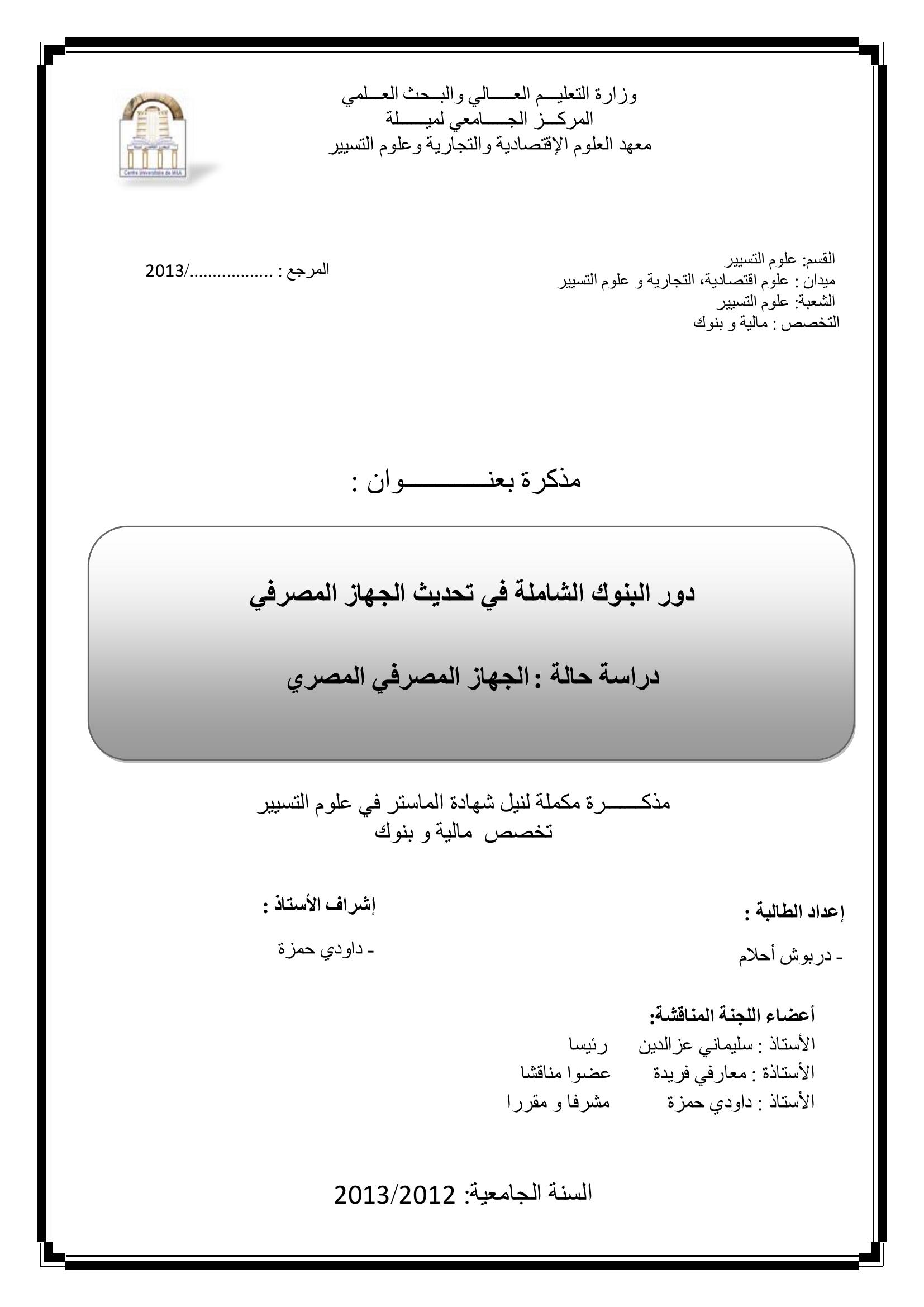 دربوش أحلام & , س. (2013). دور البنوك الشاملة في تحديث الجهاز المصرفي دراسة حالة الجهاز المصرفي المصري.