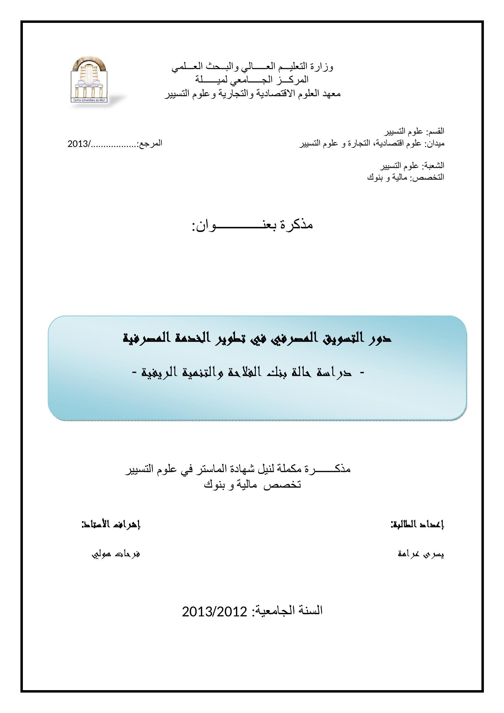 عرامة يسرى & هولي فرحات (مشرفا) (2013). دور التسويق المصرفي في تطوير الخدمة المصرفية دراسة حالة بنك الفلاحة والتنمية الريفية -وكالة ميلة-.