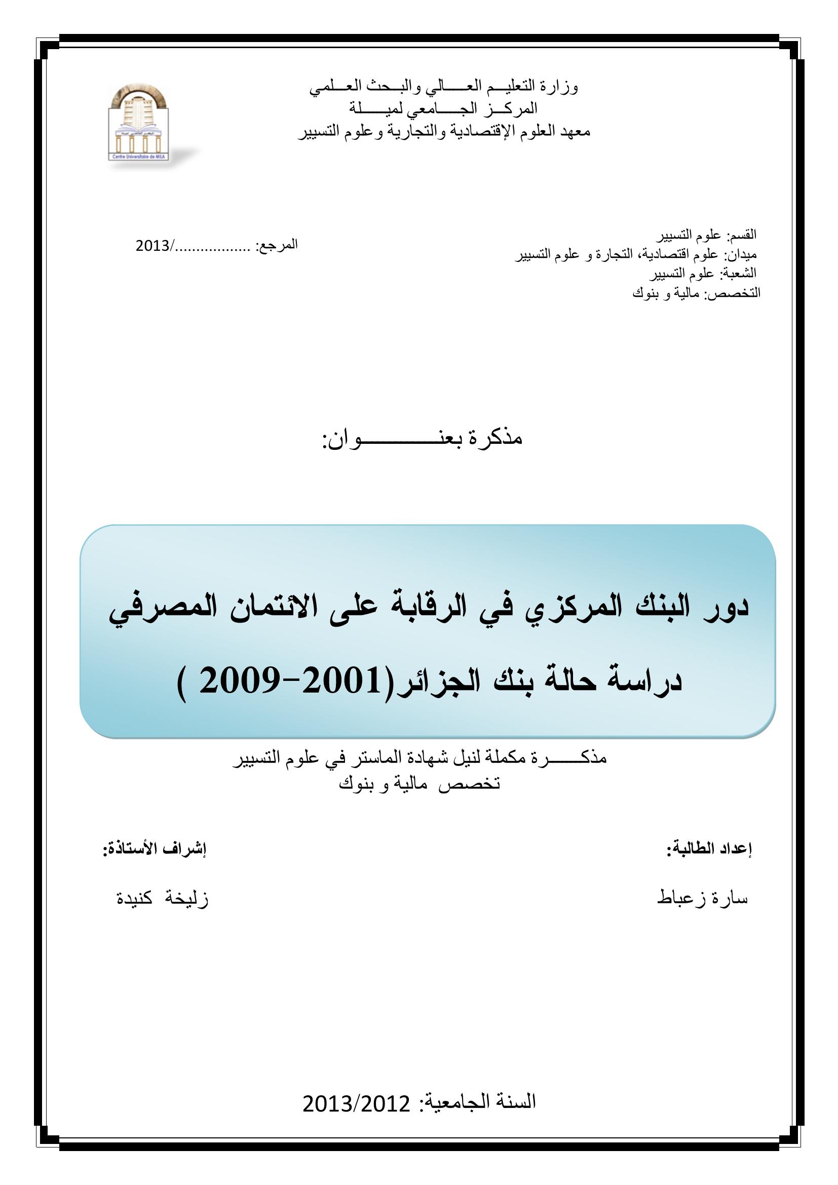 سارة زعباط & ،كنيدة زليخة(رئيسا)، لطرش جمال(مناقشا)، بوالريحان(مشرفا ومقررا) (2013). دور البنك المركزي في الرقابة على الائتمان المصرفي دراسة حالة بنك الجزائر 2009/2001.