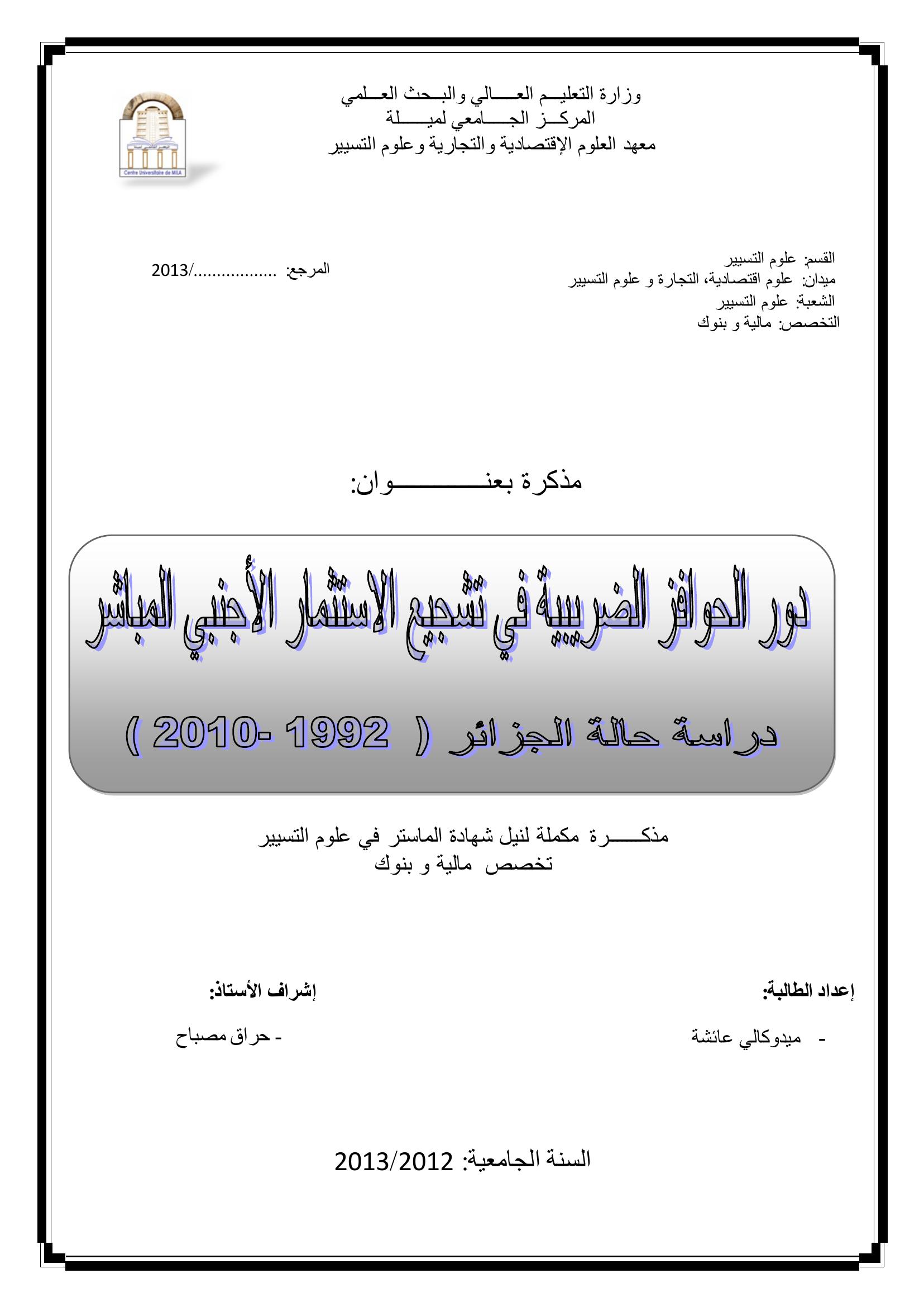 ميدوكالي عائشة & حراق مصباح (مشرفا) (2013). دور التحفيزات الضريبية في تشجيع الإستثمار الأجنبي المباشر دراسة حالة الجزائر (1992-2010).