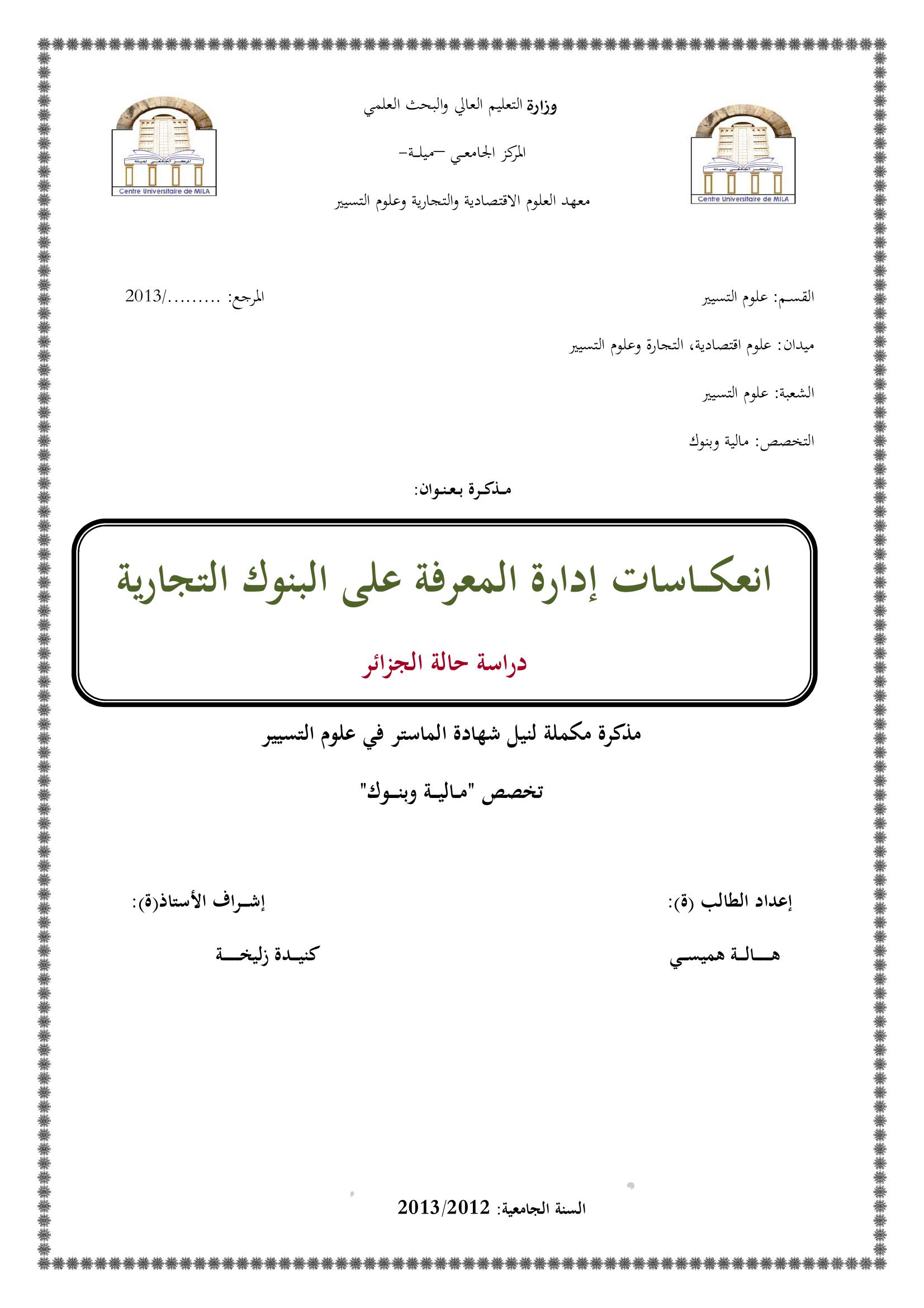 هالة هميسي & ،كنيدة زليخة(رئيسا)، لطرش جمال(مناقشا)، بوالريحان(مشرفا ومقررا) (2013). انعكاسات إدارة المعرفة على البنوك التجارية دراسة حالة الجزائر.