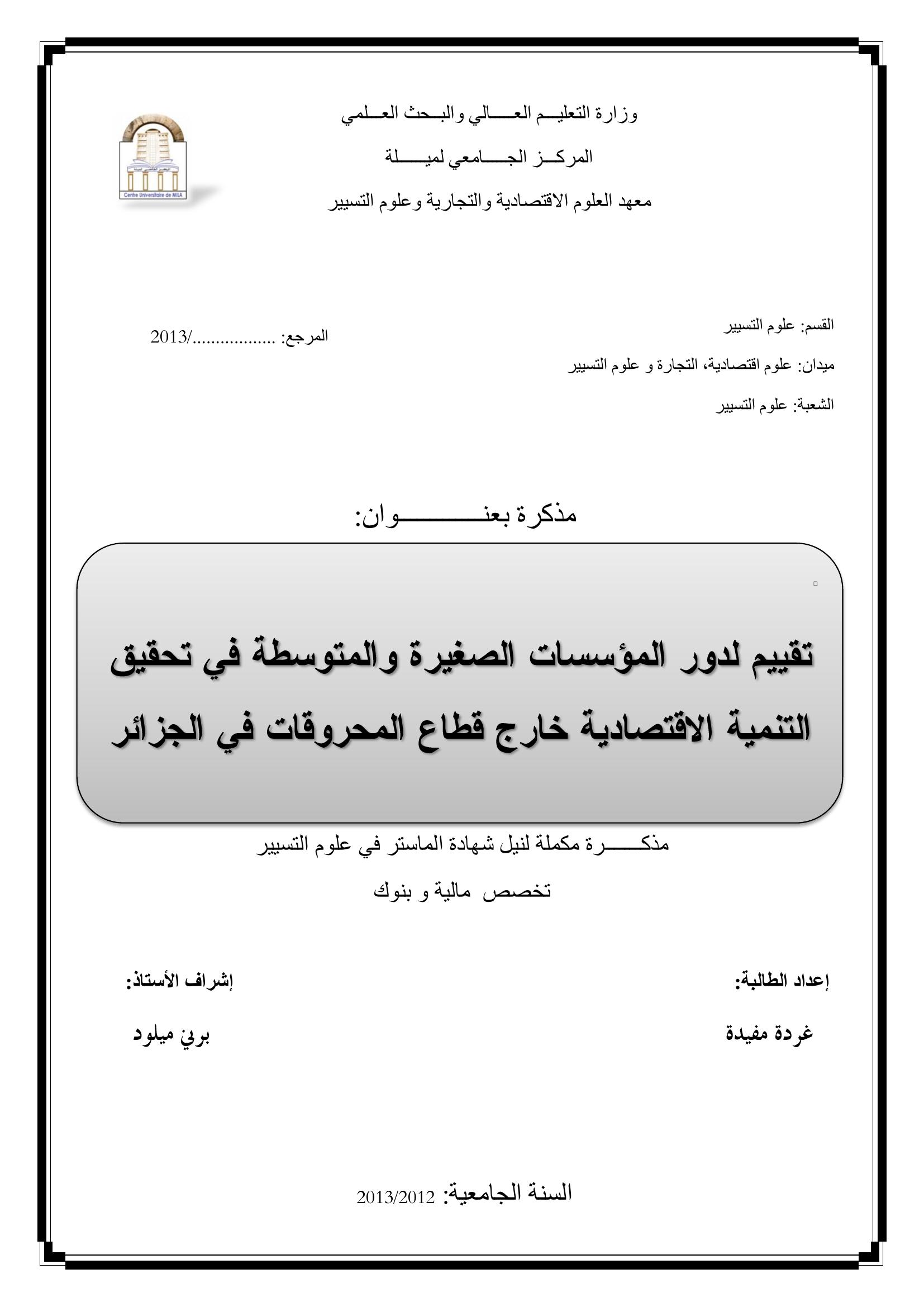 غردة مفيدة & برني ميلود (مشرفا) (2013). تقييم لدور المؤسسات الصغيرة والمتوسطة في تحقيق التنمية الاقتصادية خارج قطاع المحروقات في الجزائر دراسة حالة الجزائر 1990 -2012.