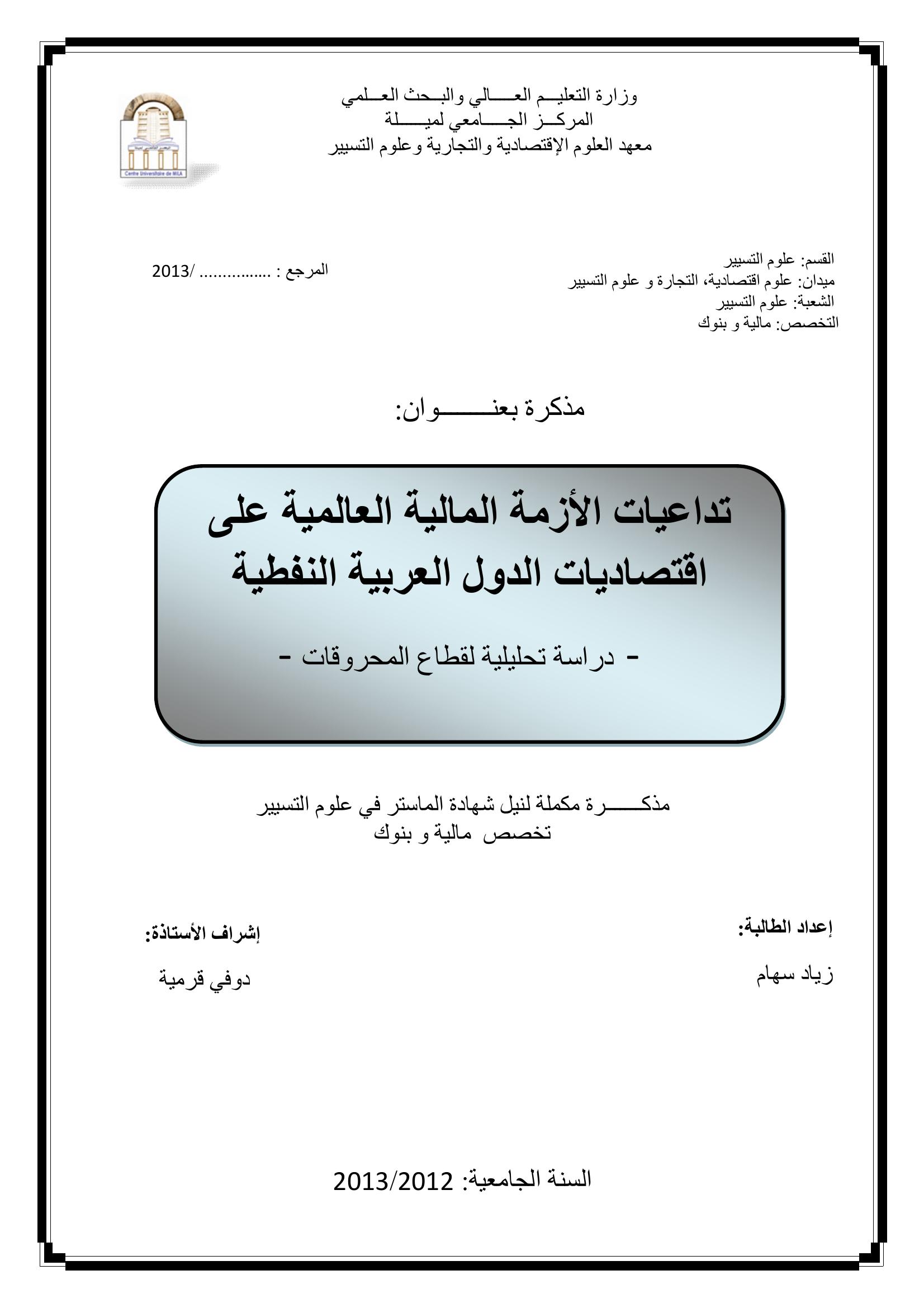 زياد سهام & دوفي قرمية(مشرفا) (2013). تداعيات الأزمة المالية العالمية على إقتصاديات الدول العربية النفطية دراسة تحليلية لقطاع المحروقات.